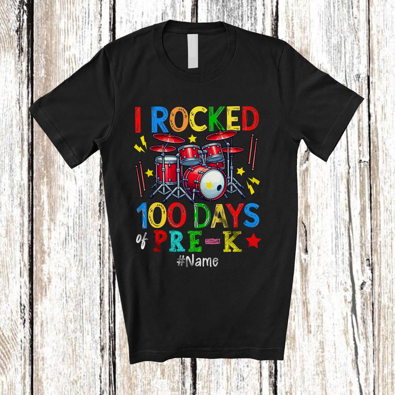 Personalized I Rocked 100th Day of Pre-K; Amusing School Drum; Custom Name Drummer T-Shirt. This cotton t-shirt is a durable staple product with a classic fit. One of the most popular items, it has a relaxed style made for everyday and casual wear.