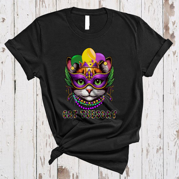 Cat Tuesday, Adorable Mardi Gras Mask Kitten Face Wearing Beads Jester Hat, Family Group T-Shirt