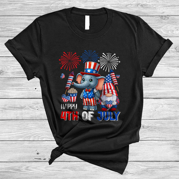 Happy 4th Of July, Lovely Independence Day US Flag Elephant, Firework Gnomes Patriotic T-Shirt