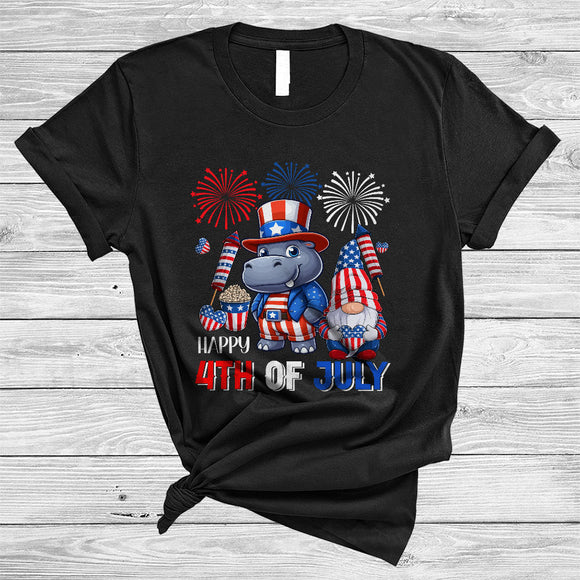 Happy 4th Of July, Lovely Independence Day US Flag Hippo, Firework Gnomes Patriotic T-Shirt