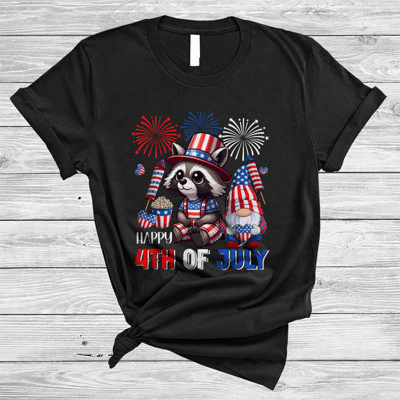 Happy 4th Of July, Lovely Independence Day US Flag Raccoon, Firework Gnomes Patriotic T-Shirt