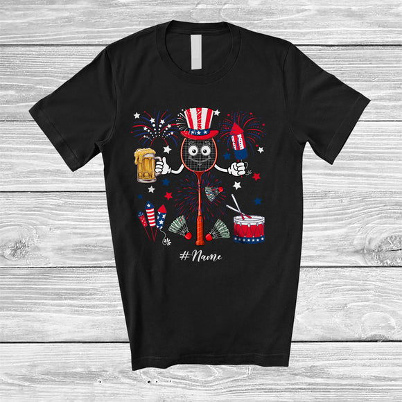 Personalized Badminton Drinking Beer; Proud 4th Of July Custom Name Badminton Player; Patriotic T-Shirt