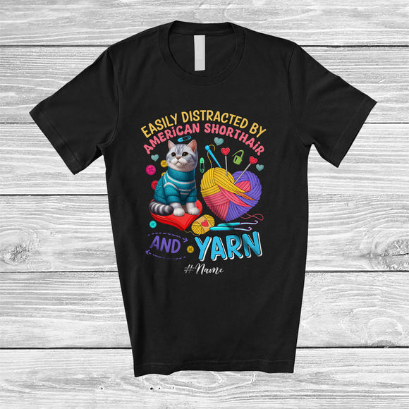 Personalized Custom Name Easily Distracted By American Shorthair And Yarn; Lovely Knitting Heart T-Shirt