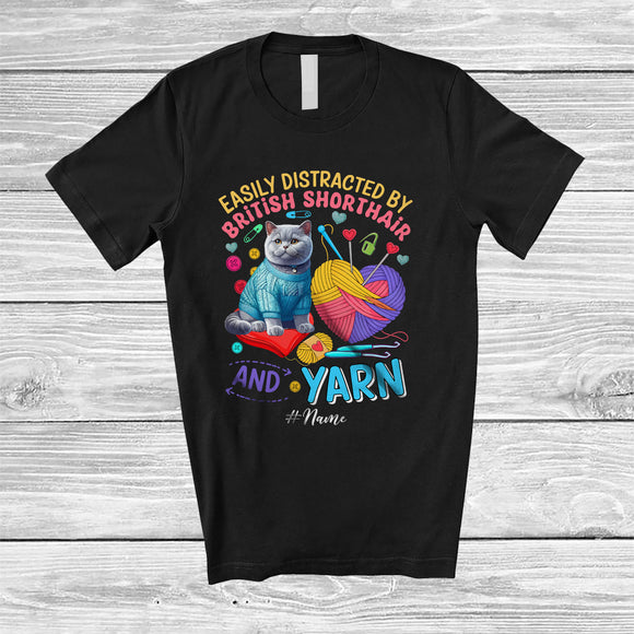 Personalized Custom Name Easily Distracted By British Shorthair And Yarn; Lovely Knitting Heart T-Shirt