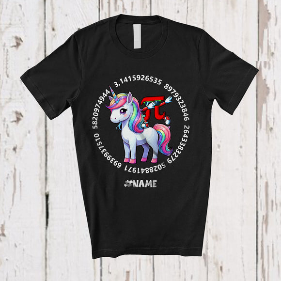 Personalized Custom Name Dabbing Pi Riding Unicorn; Cheerful Pi Day Math Nerd Student Teacher T-Shirt