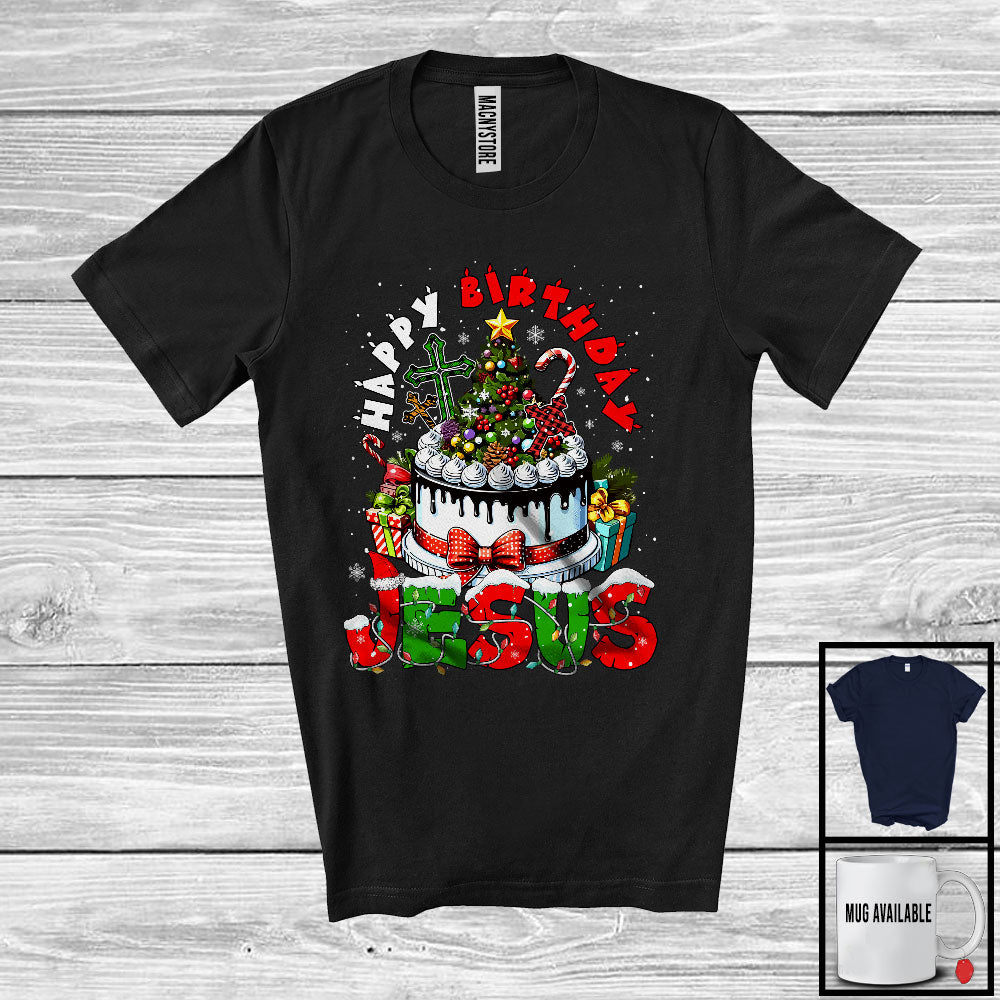 The Happy Birthday Jesus; Wonderful Christmas Lights Cross Birthday Cake; Snowing Family T-Shirt destined to impress, and priced at only $12.95, for a limited time.