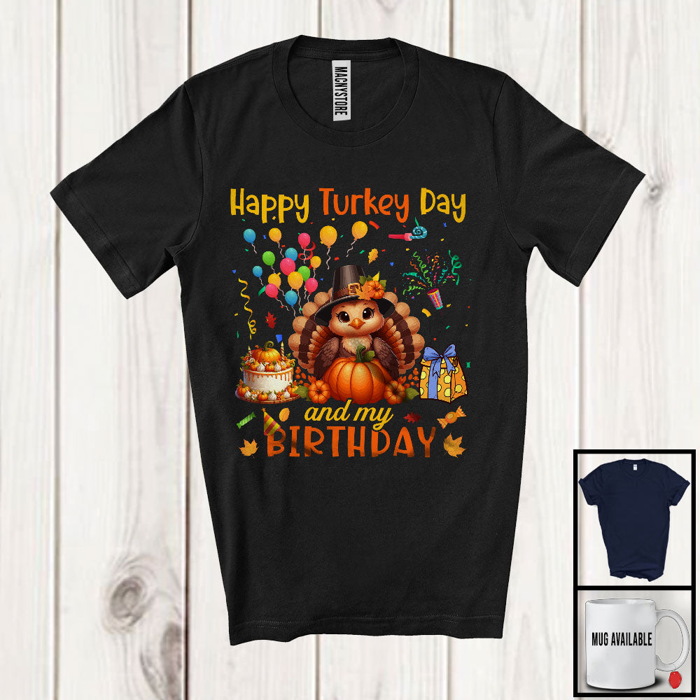 Happy Turkey Day And My Birthday; Adorable Thanksgiving Turkey Pumpkin Lover; Family Group T-Shirt. This cotton t-shirt is a durable staple product with a classic fit. One of the most popular items, it has a relaxed style made for everyday and casual wear.