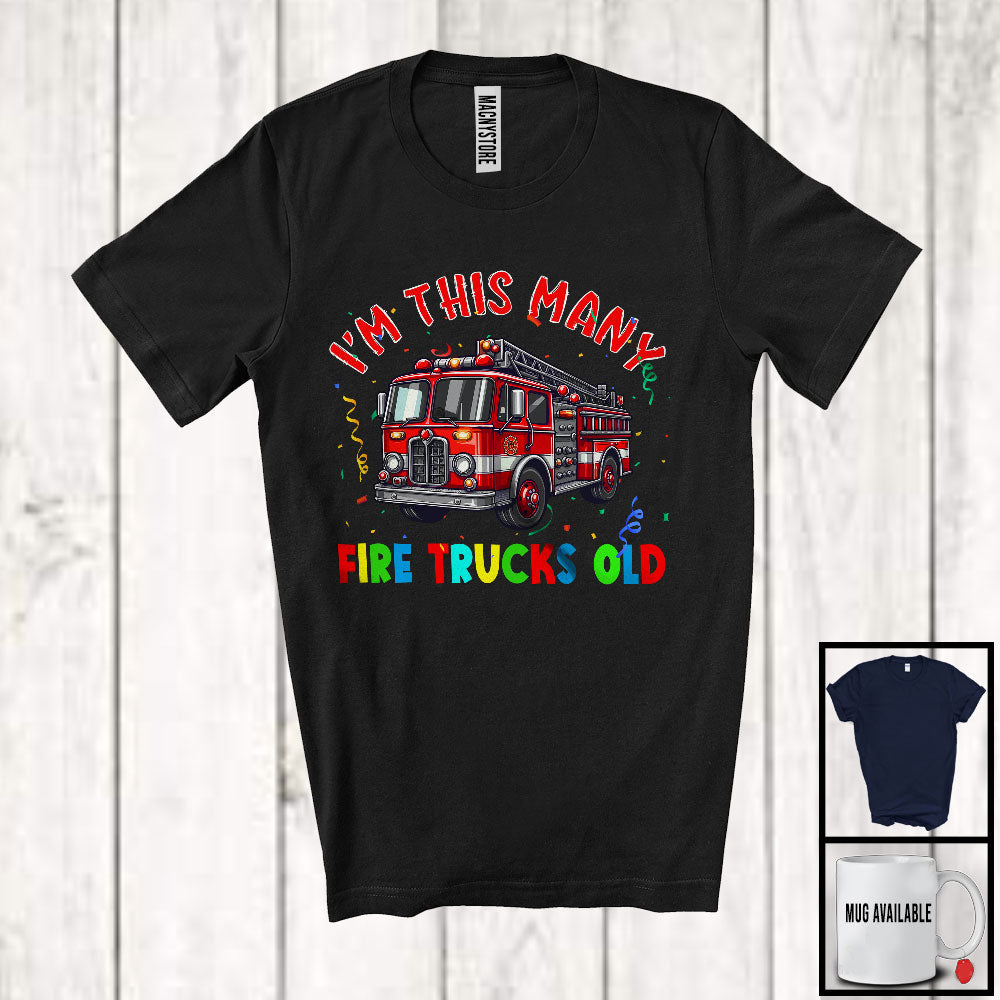 I'm This Many Fire Trucks Old; Cheerful 1st Birthday One Fire Truck; Boys Family Group T-Shirt. This cotton t-shirt is a durable staple product with a classic fit. One of the most popular items, it has a relaxed style made for everyday and casual wear.