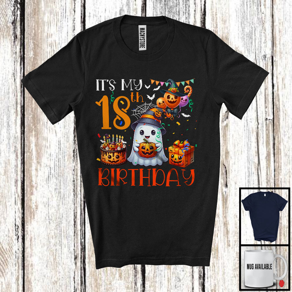 It's My 18th Happy Birthday, Adorable Halloween Costume Birthday Boo Ghost, Pumpkin Cake T-Shirt. This cotton t-shirt is a durable staple product with a classic fit. One of the most popular items, it has a relaxed style made for everyday and casual wear.