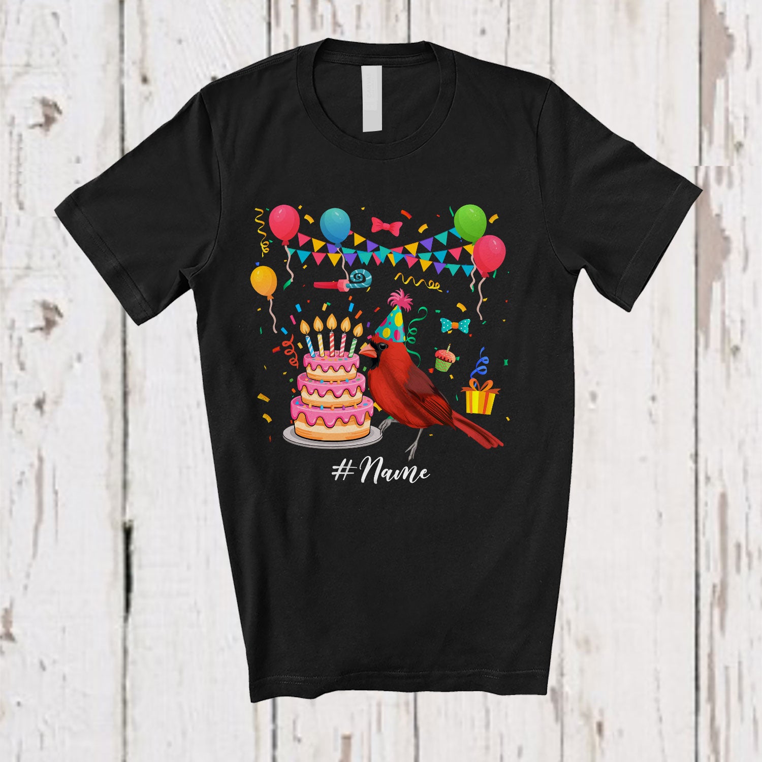 Personalized Birthday Party Cardinal Bird With Cake; Amazing Custom Name Bird Animal Lover T-Shirt. This cotton t-shirt is a durable staple product with a classic fit. One of the most popular items, it has a relaxed style made for everyday and casual wear.
