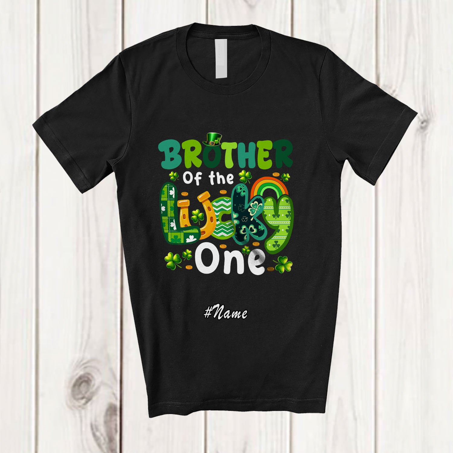 • Personalized Custom Name Brother Of Lucky One; Amusing St. Patrick's Day Birthday Shamrock Family T-Shirt. This cotton t-shirt is a durable staple product with a classic fit. One of the most popular items, it has a relaxed style made for everyday and casual wear.