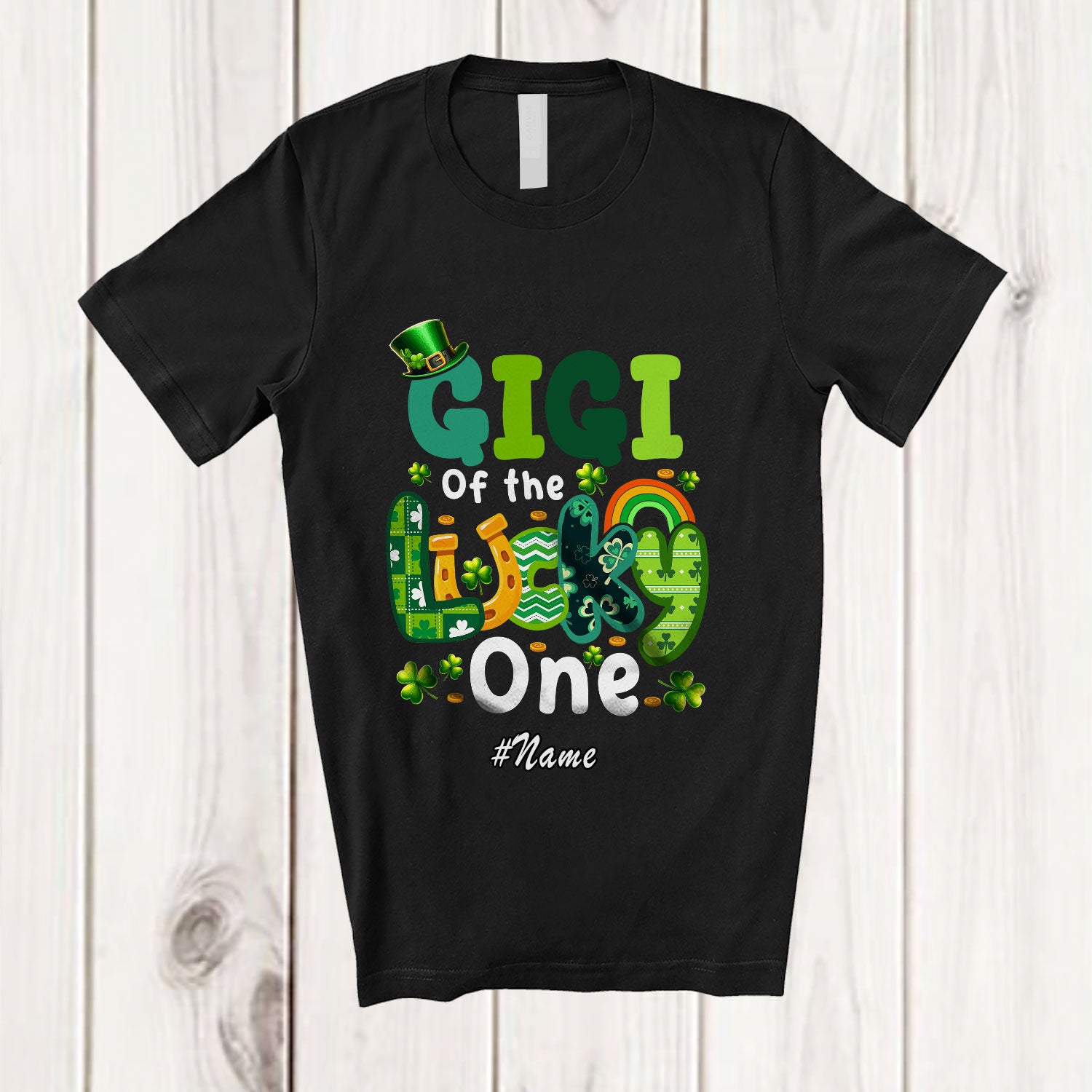 • Personalized Custom Name Gigi Of Lucky One; Amusing St. Patrick's Day Birthday Shamrock Family T-Shirt. This cotton t-shirt is a durable staple product with a classic fit. One of the most popular items, it has a relaxed style made for everyday and casual wear.