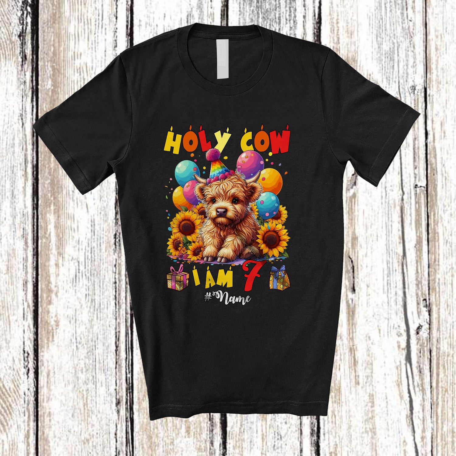 Personalized Custom Name Holy Cow I'm 7 Year Old; Lovely 7th Birthday Highland Cow Sunflowers T-Shirt