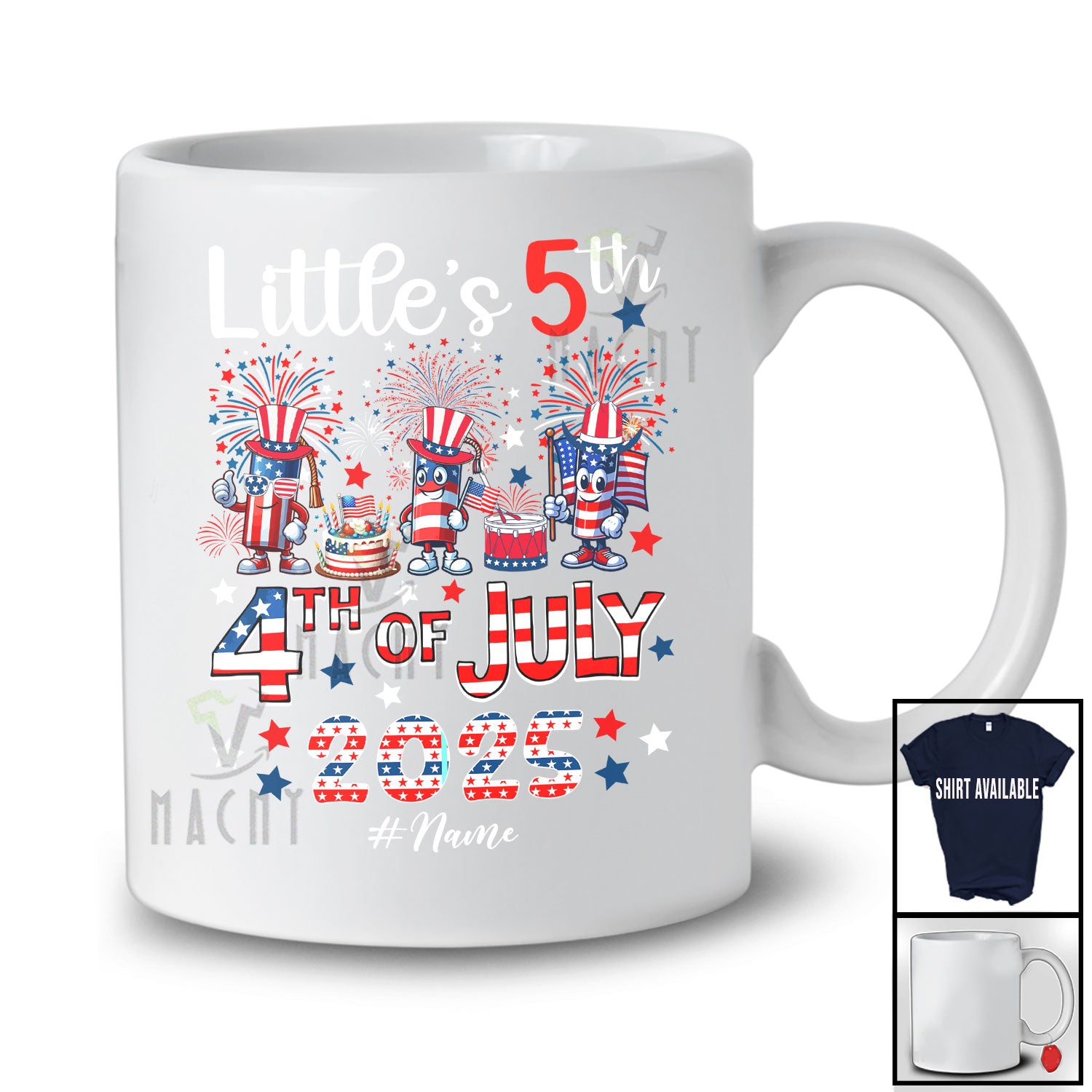 • Personalized Little's 5th 4th of July 2025; Joyful Birthday Three Firecracker; Custom Name Patriotic T-Shirt. This cotton t-shirt is a durable staple product with a classic fit. One of the most popular items, it has a relaxed style made for everyday and casual wear.