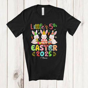 Personalized Little's 5th Easter 2025; Joyful Birthday Three Bunnies Eggs Hunt; Custom Name Family T-Shirt