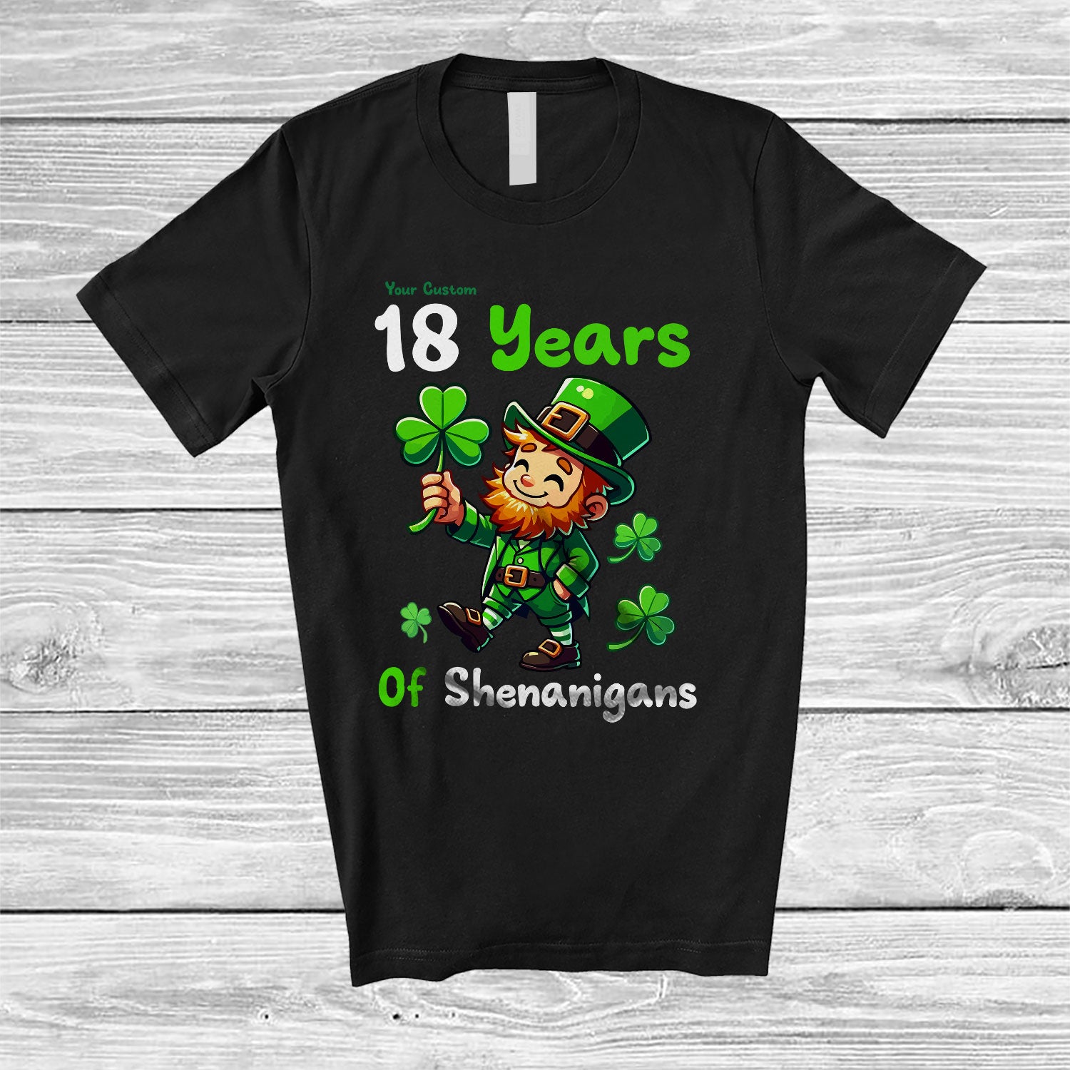 • Personalized Your Custom 18 Years of Shenanigans; Joyful St. Patrick's Day 18th Birthday Family T-Shirt. This cotton t-shirt is a durable staple product with a classic fit. One of the most popular items, it has a relaxed style made for everyday and casual wear.