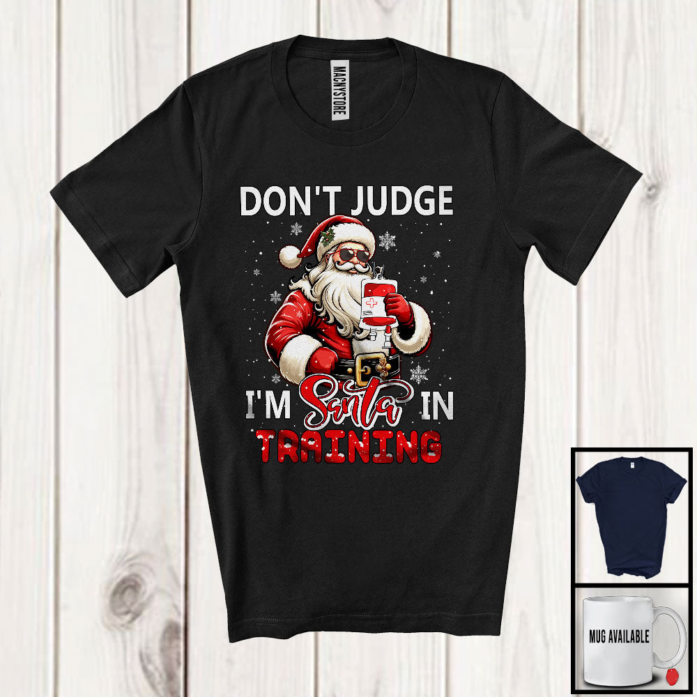 Don't Judge I'm Santa In Training; Sarcastic Christmas Phlebotomist Santa; Snowing X-mas Family T-Shirt. This cotton t-shirt is a durable staple product with a classic fit. One of the most popular items, it has a relaxed style made for everyday and casual wear.