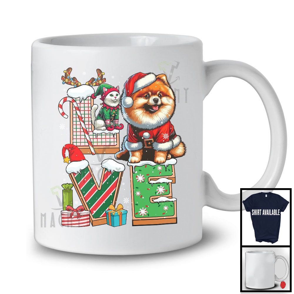 LOVE, Joyful Christmas Santa Pomeranian Owner Lover, X-mas Candy Cane Snowing Around T-Shirt