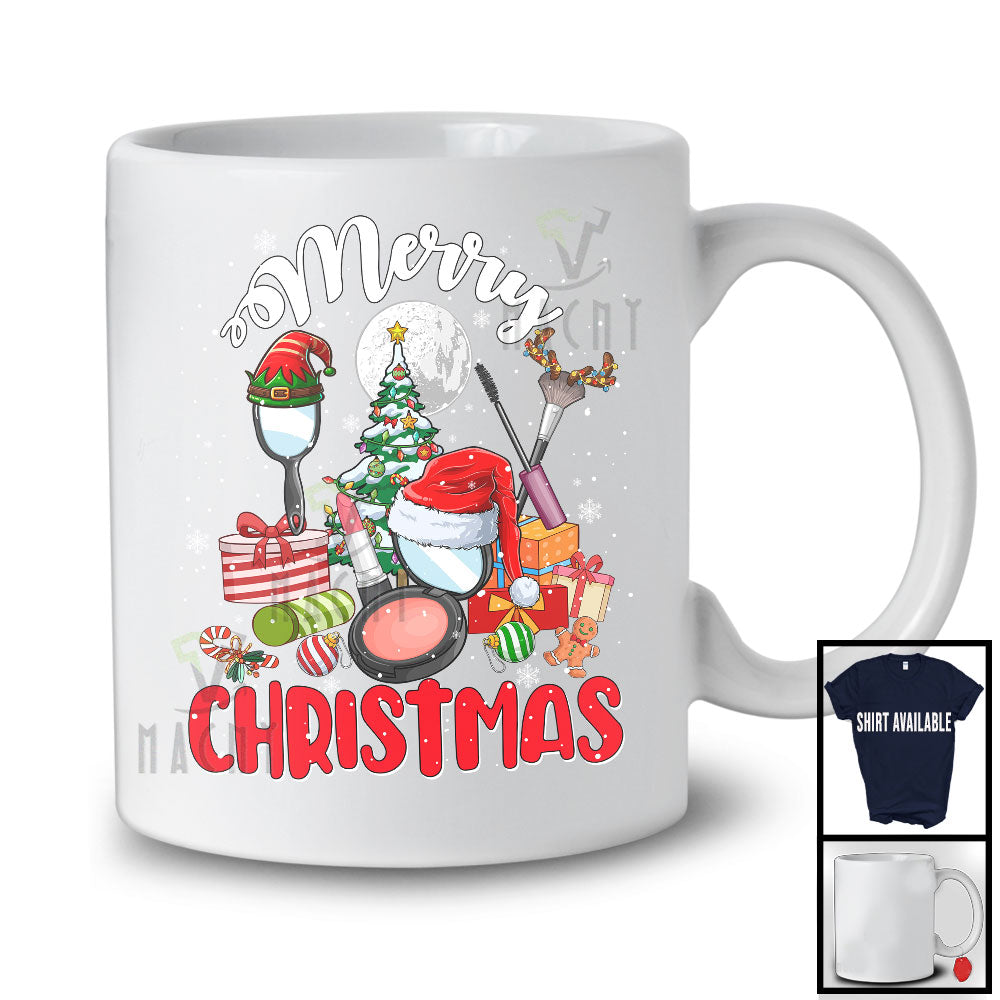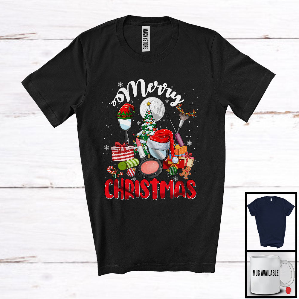Merry Christmas, Cheerful X-mas Three Santa ELF Reindeer Tools, Matching Esthetician Group T-Shirt. This cotton t-shirt is a durable staple product with a classic fit. One of the most popular items, it has a relaxed style made for everyday and casual wear.