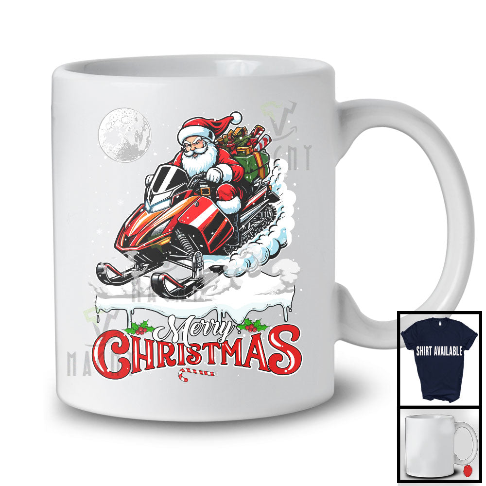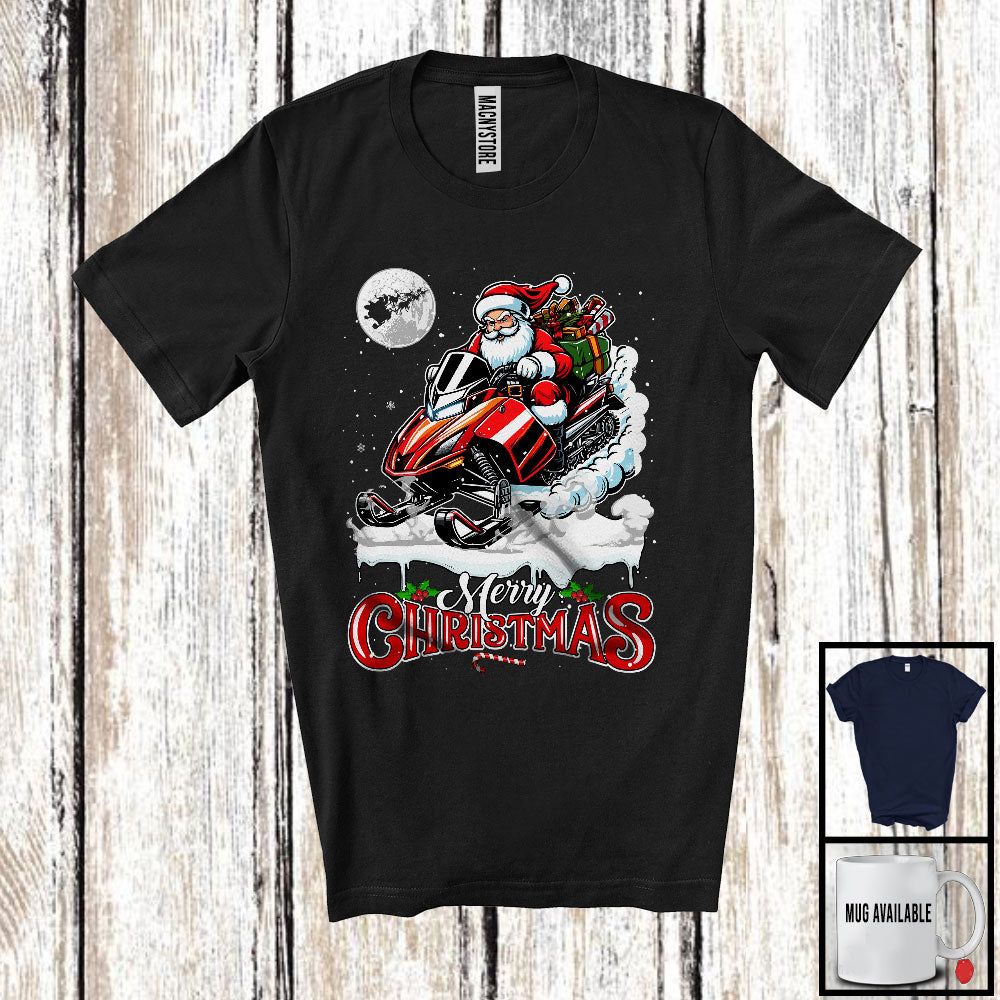Merry Christmas; Joyful X-mas Moon Tree Santa Riding Snowmobile Snowing Lover; Family Group T-Shirt