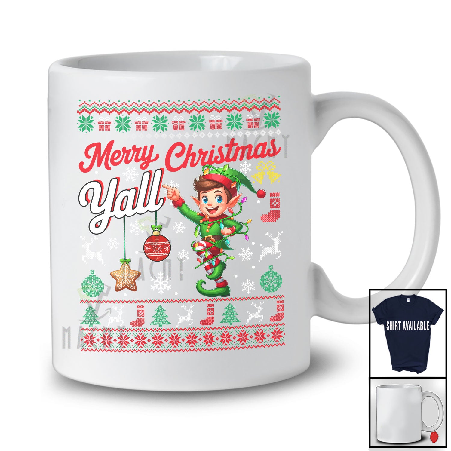 • Merry Christmas Yall; Cheerful X-mas Lights Elf Snowing Around; Sweater Family Group T-Shirt. This cotton t-shirt is a durable staple product with a classic fit. One of the most popular items, it has a relaxed style made for everyday and casual wear.