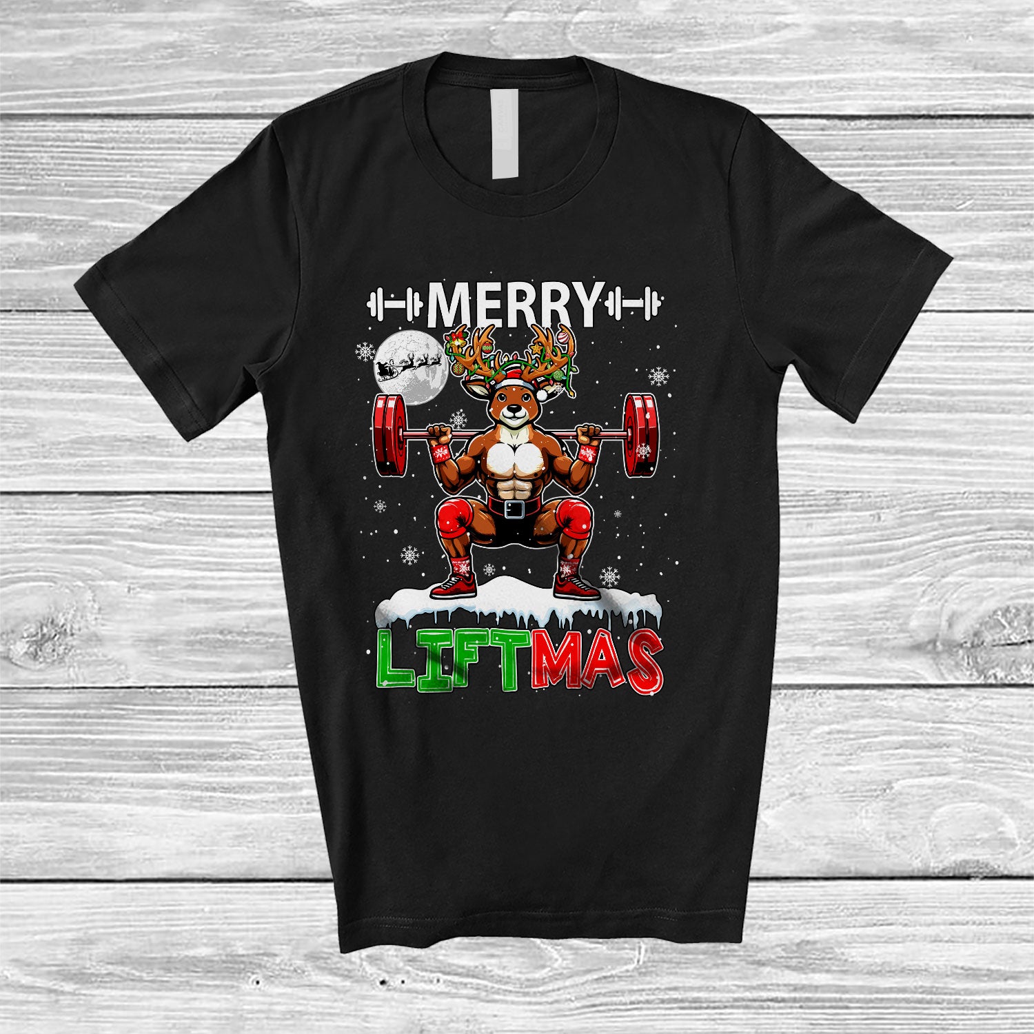 • Merry Liftmas; Humorous Christmas Muscle Reindeer Weightlifting; X-mas Gym Workout Group T-Shirt. This cotton t-shirt is a durable staple product with a classic fit. One of the most popular items, it has a relaxed style made for everyday and casual wear.