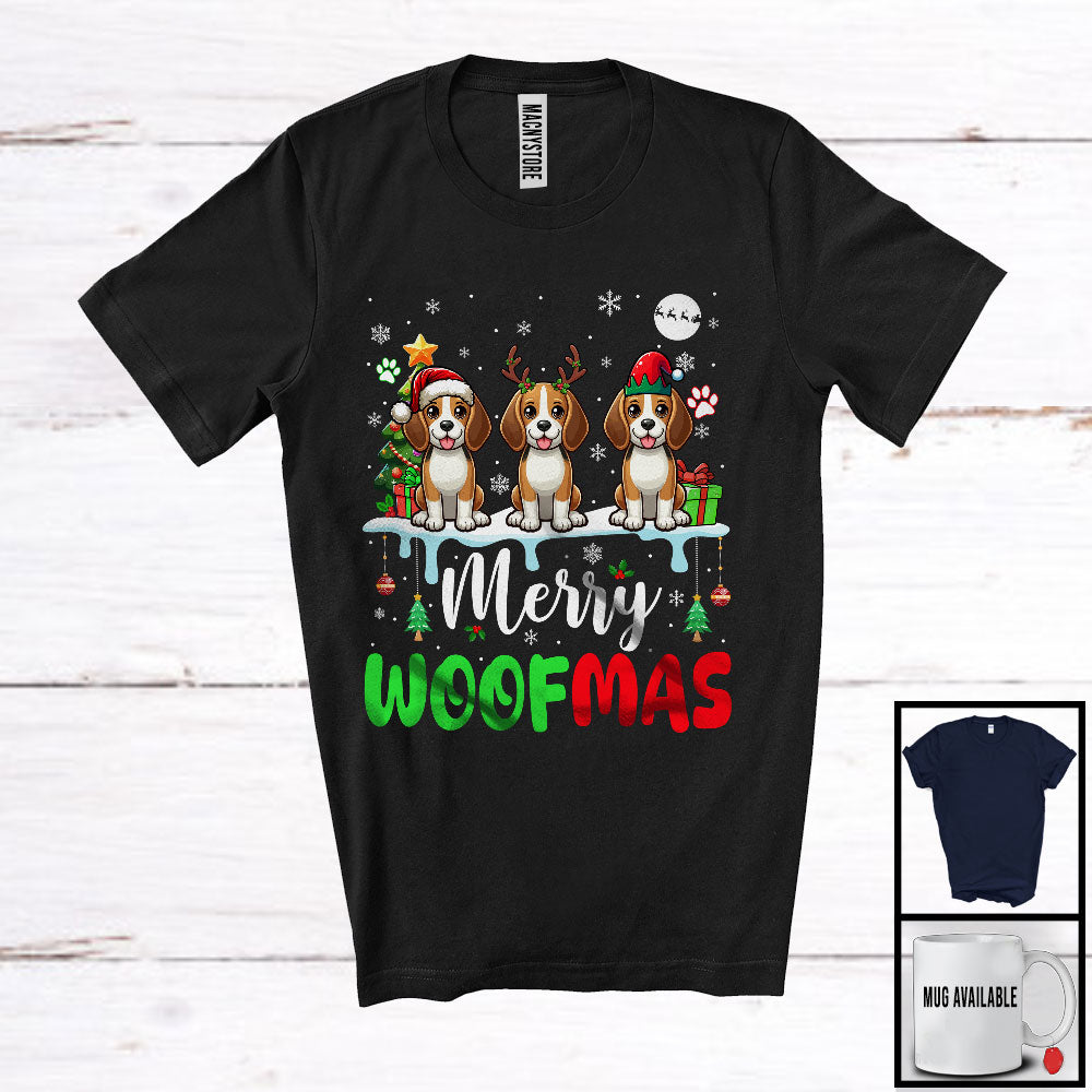 Merry Woofmas; Lovely Christmas Three Reindeer Elf Santa Beagle Owner; Snowing T-Shirt