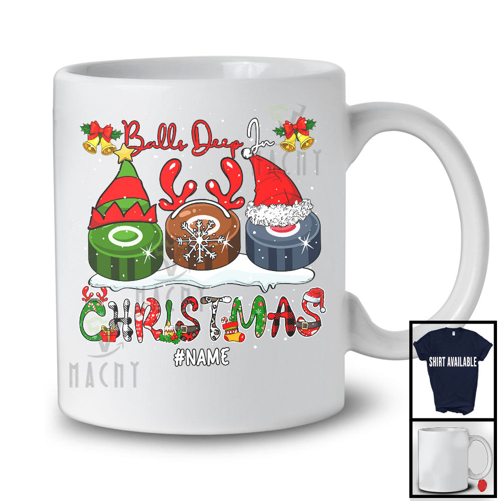 Personalized Balls Deep In Christmas; Joyful Three Ice Hockey Ornaments; Custom Name Sport Player T-Shirt