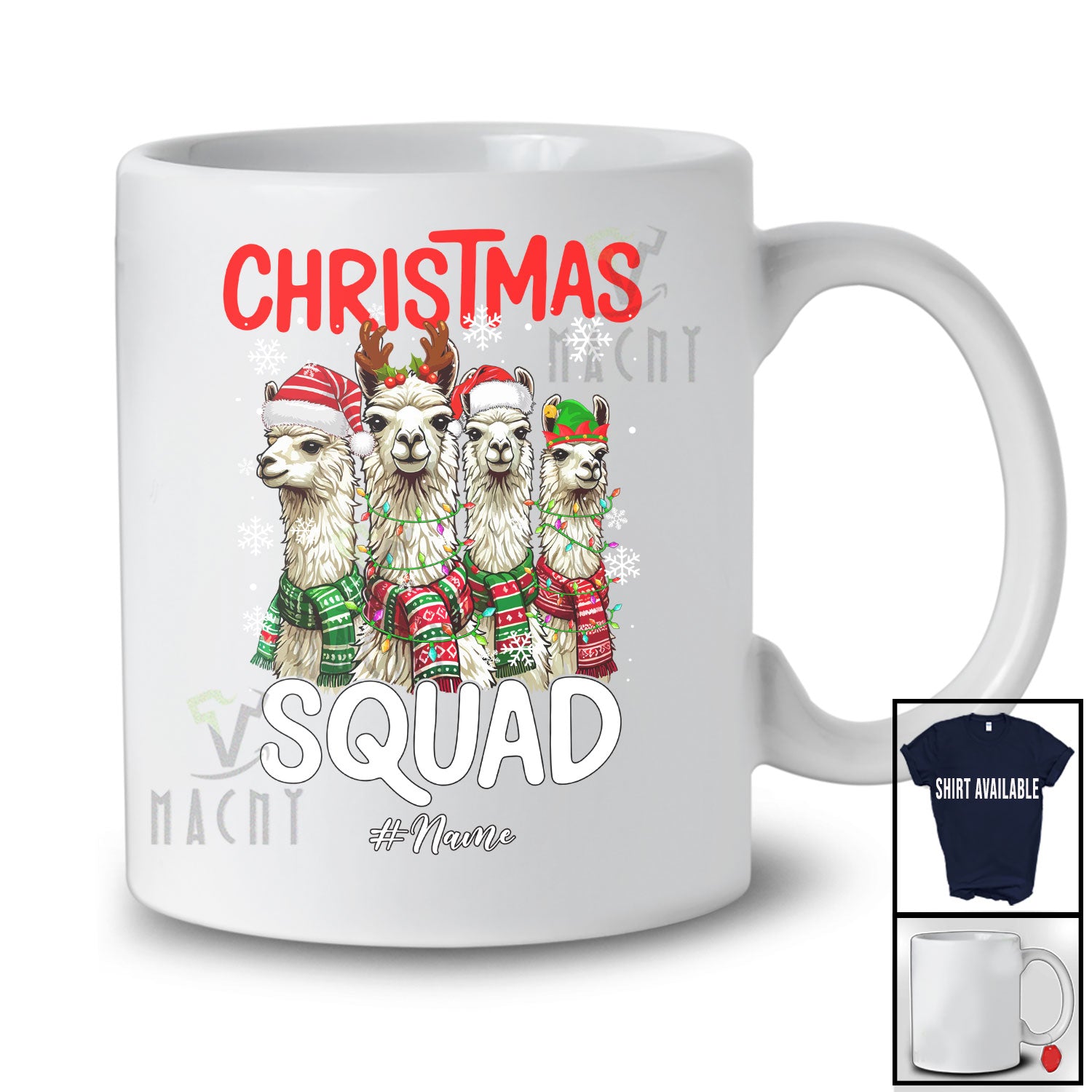 • Personalized Christmas Squad; Amusing X-mas Lights Four Llamas; Custom Name Wild Animal T-Shirt. This cotton t-shirt is a durable staple product with a classic fit. One of the most popular items, it has a relaxed style made for everyday and casual wear.