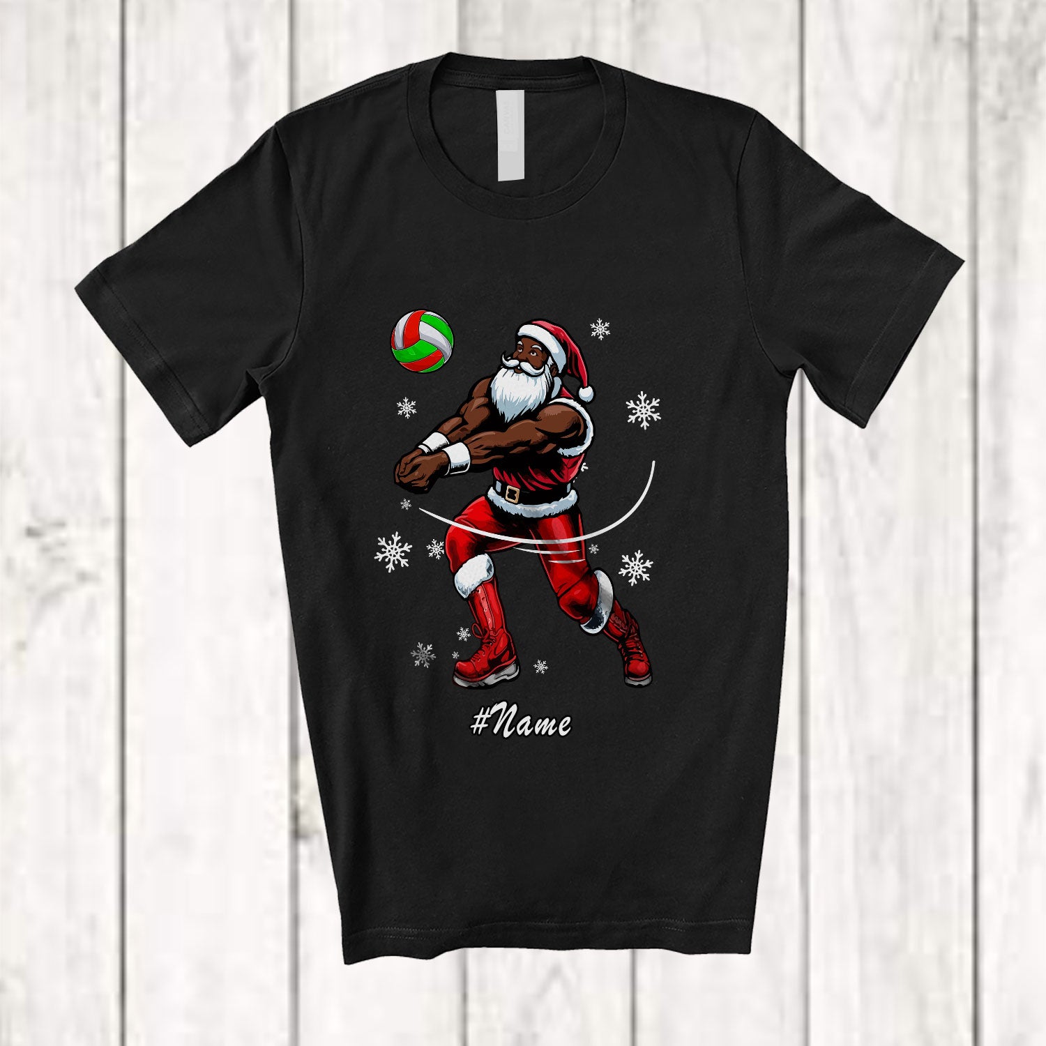 • Personalized Custom Name Black African Santa Playing Volleyball; Joyful Christmas Afro Player T-Shirt. This cotton t-shirt is a durable staple product with a classic fit. One of the most popular items, it has a relaxed style made for everyday and casual wear.
