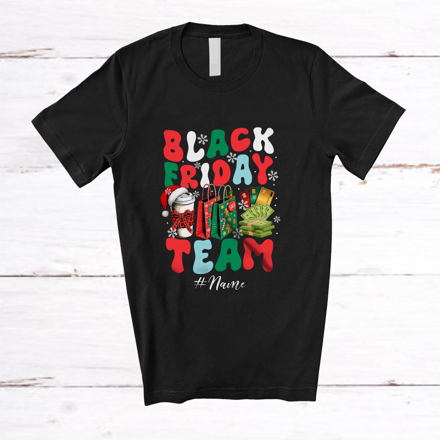 • Personalized Custom Name Black Friday Team; Amazing Christmas Shopping Family Friends Group T-Shirt. This cotton t-shirt is a durable staple product with a classic fit. One of the most popular items, it has a relaxed style made for everyday and casual wear.