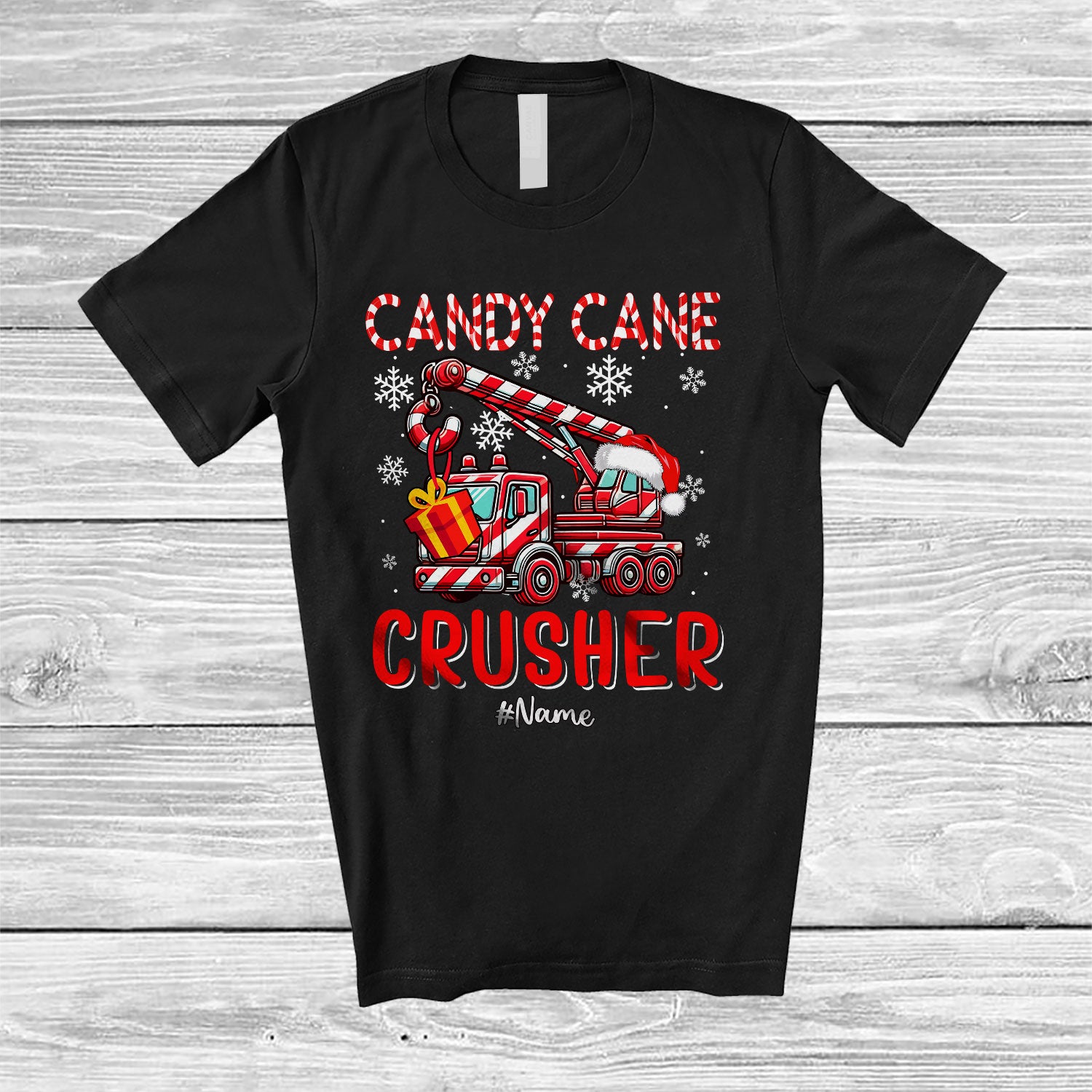 Personalized Custom Name Candy Cane Crusher; Joyful Christmas Crane Truck Cosplay; Boys Family T-Shirt. This cotton t-shirt is a durable staple product with a classic fit. One of the most popular items, it has a relaxed style made for everyday and casual wear.