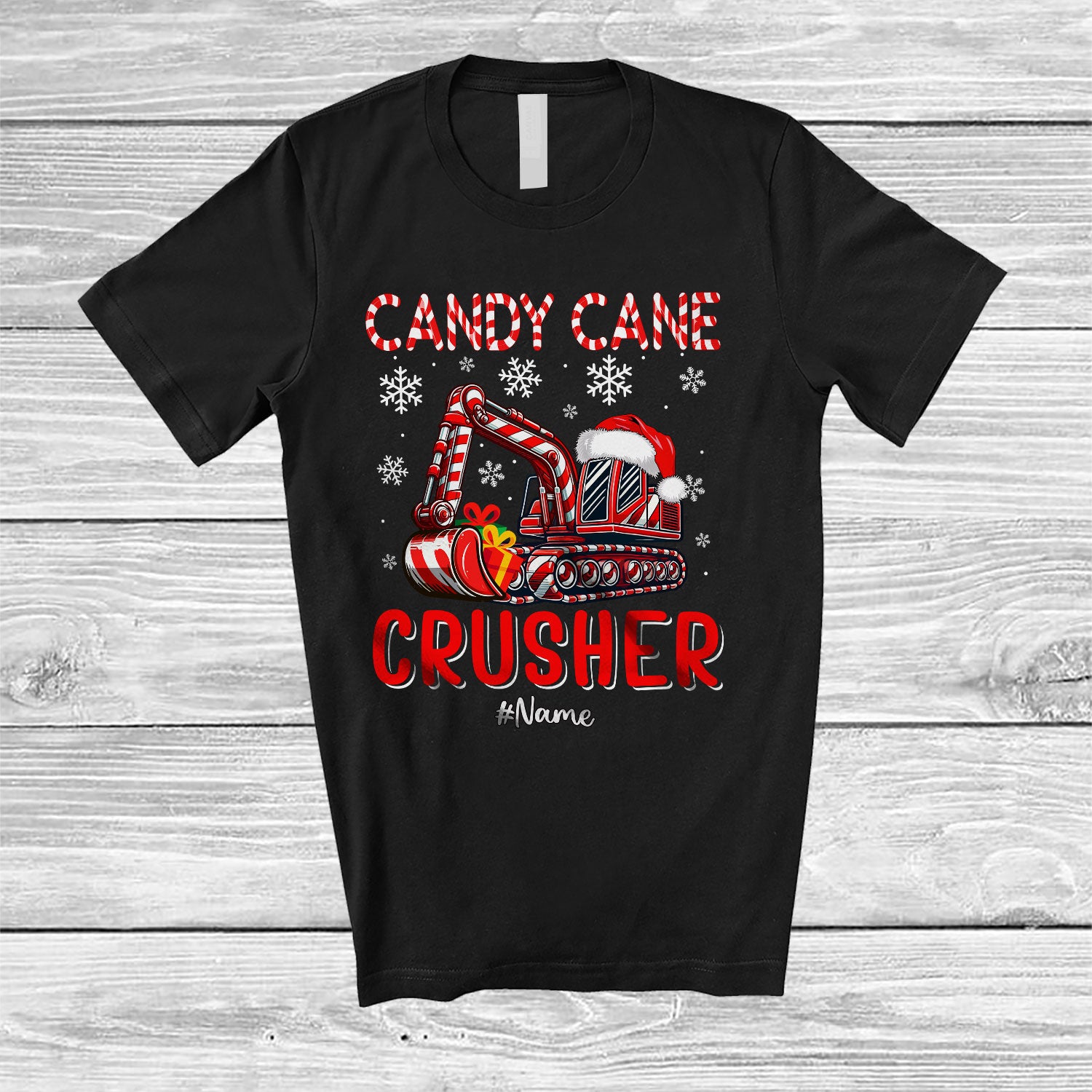 Personalized Custom Name Candy Cane Crusher; Joyful Christmas Excavator Cosplay; Boys Family T-Shirt. This cotton t-shirt is a durable staple product with a classic fit. One of the most popular items, it has a relaxed style made for everyday and casual wear.