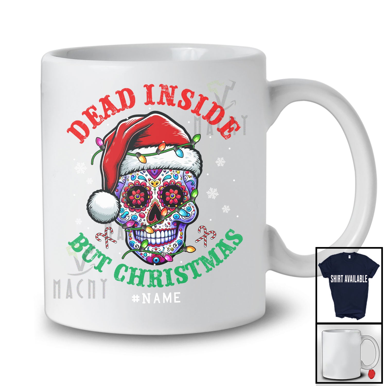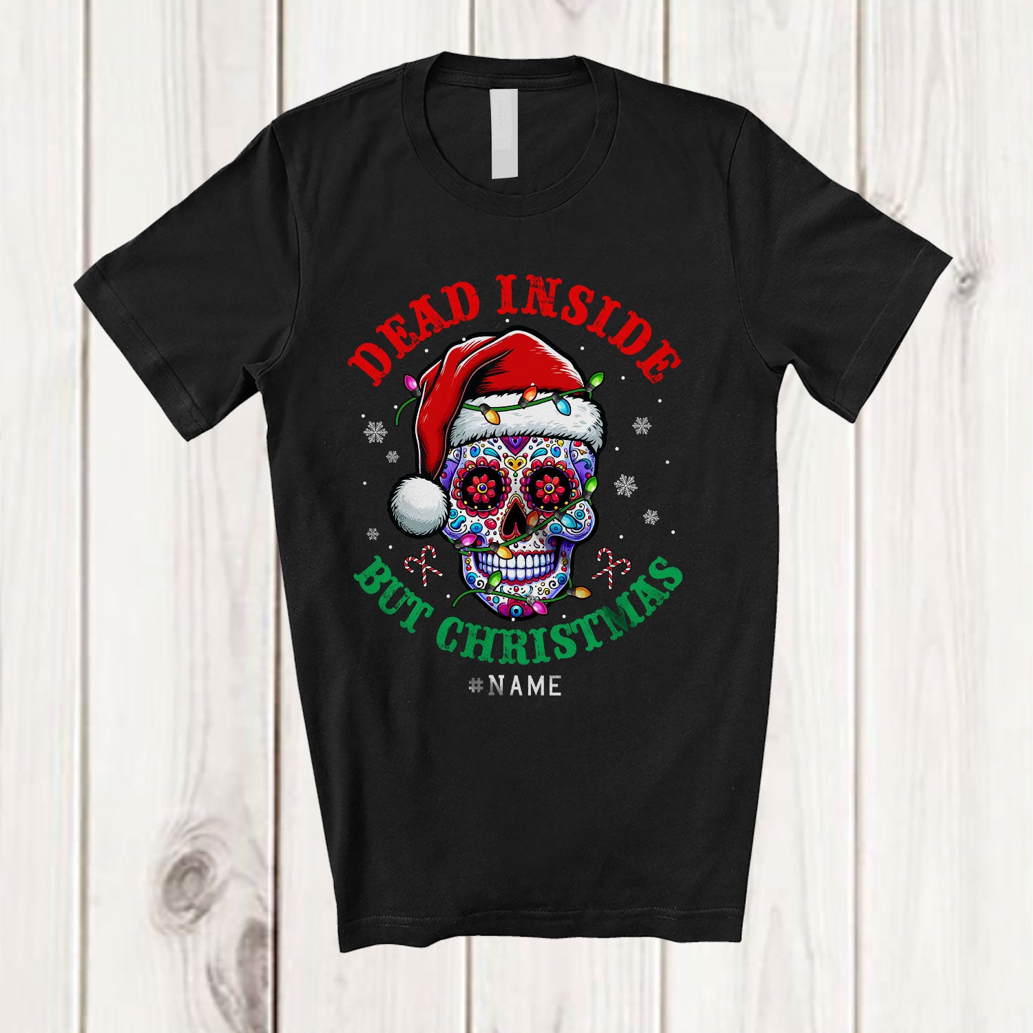 Personalized Custom Name Dead Inside But Christmas; Joyful X-mas Santa Sugar Skull; Sweater T-Shirt. This cotton t-shirt is a durable staple product with a classic fit. One of the most popular items, it has a relaxed style made for everyday and casual wear.