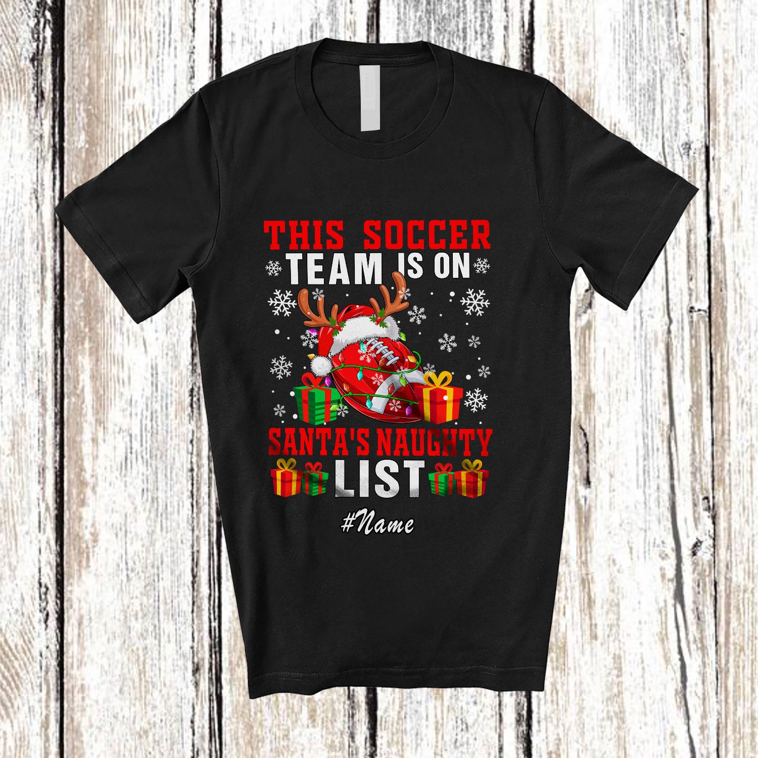 Personalized Custom Name Football Team On Santa's Naughty List; Fantastic Christmas Player T-Shirt. This cotton t-shirt is a durable staple product with a classic fit. One of the most popular items, it has a relaxed style made for everyday and casual wear.