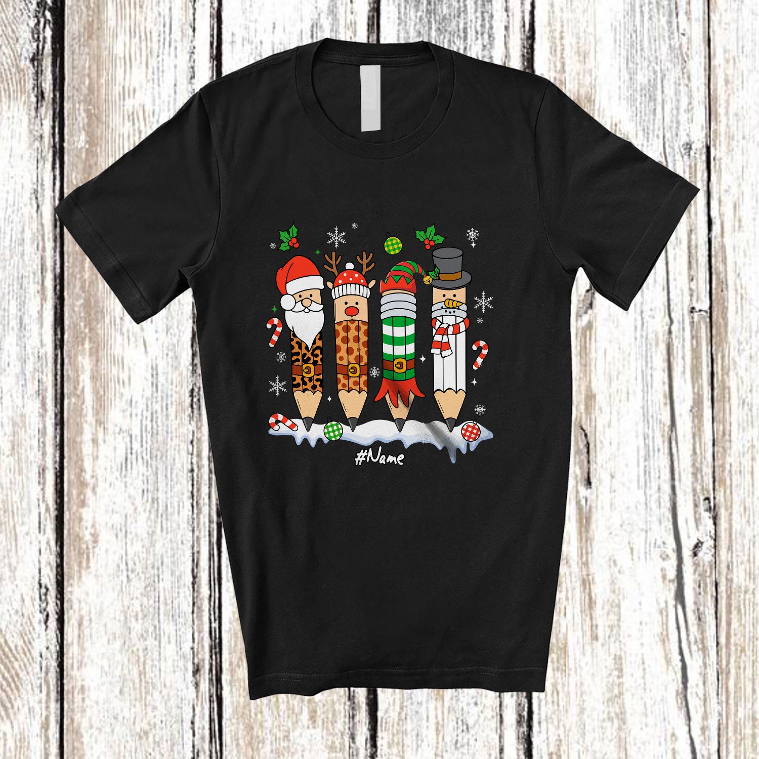 • Personalized Custom Name Four Santa Elf Reindeer Pencil; Lovely Christmas Teacher Family Group T-Shirt. This cotton t-shirt is a durable staple product with a classic fit. One of the most popular items, it has a relaxed style made for everyday and casual wear.