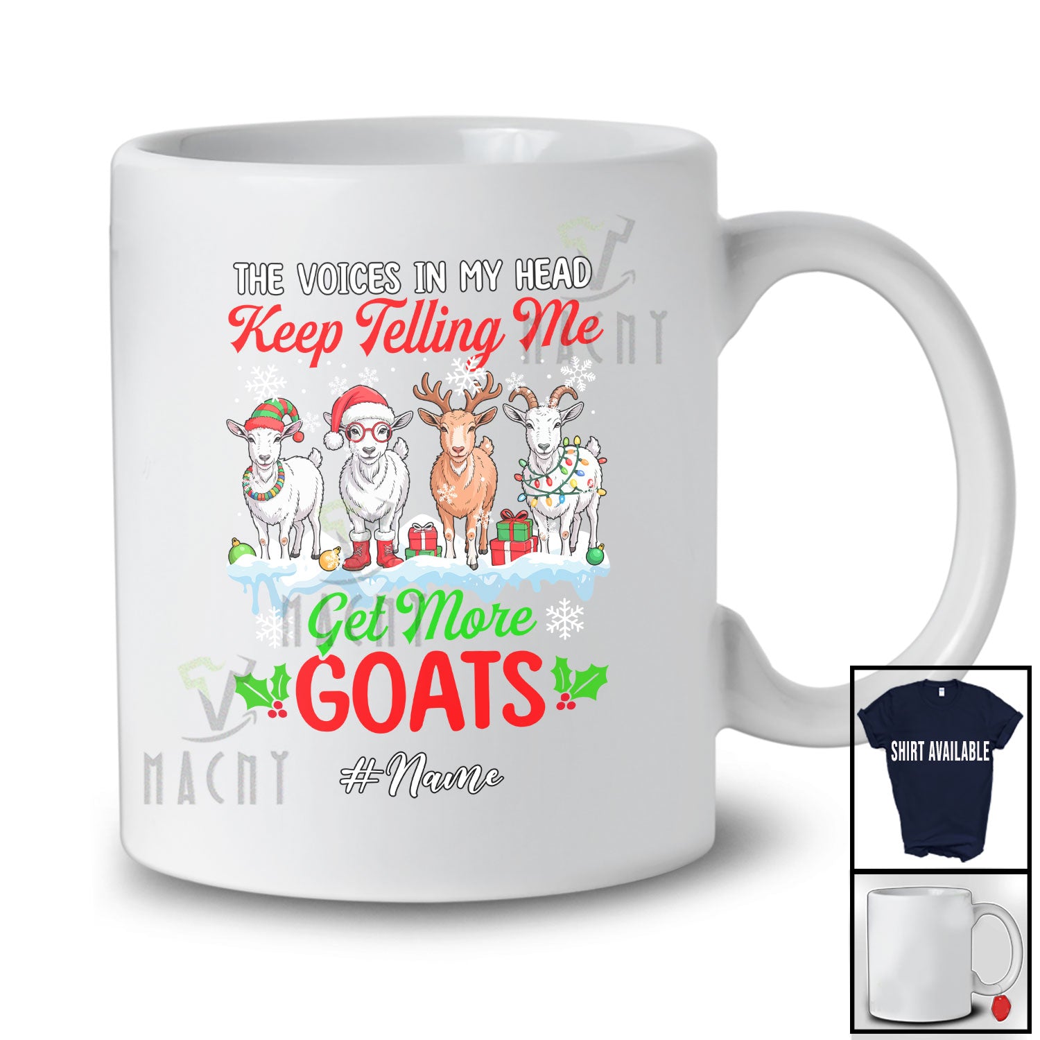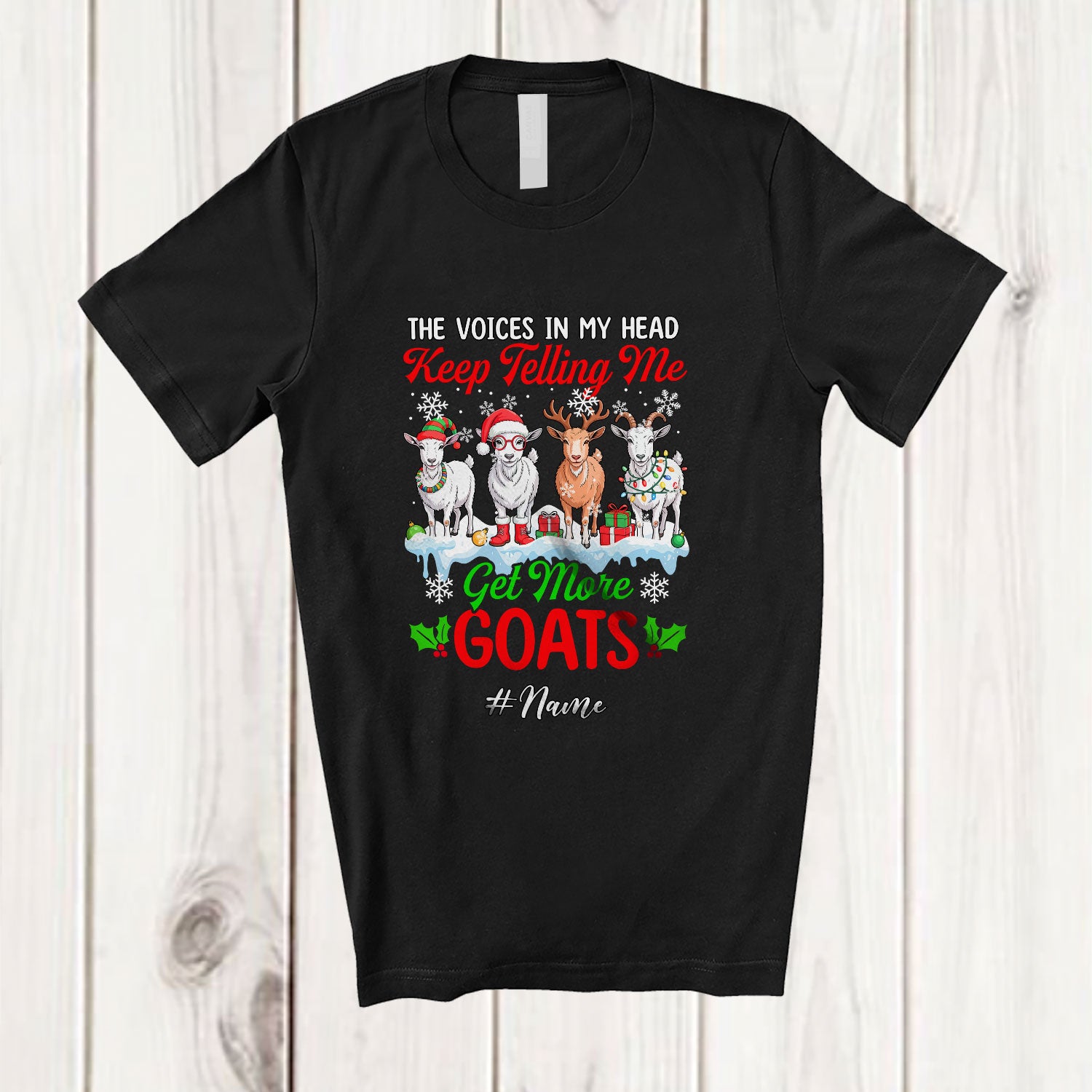 • Personalized Custom Name Get More Goats; Adorable Christmas Four Santa Elf Goats Farm Farmer T-Shirt. This cotton t-shirt is a durable staple product with a classic fit. One of the most popular items, it has a relaxed style made for everyday and casual wear.