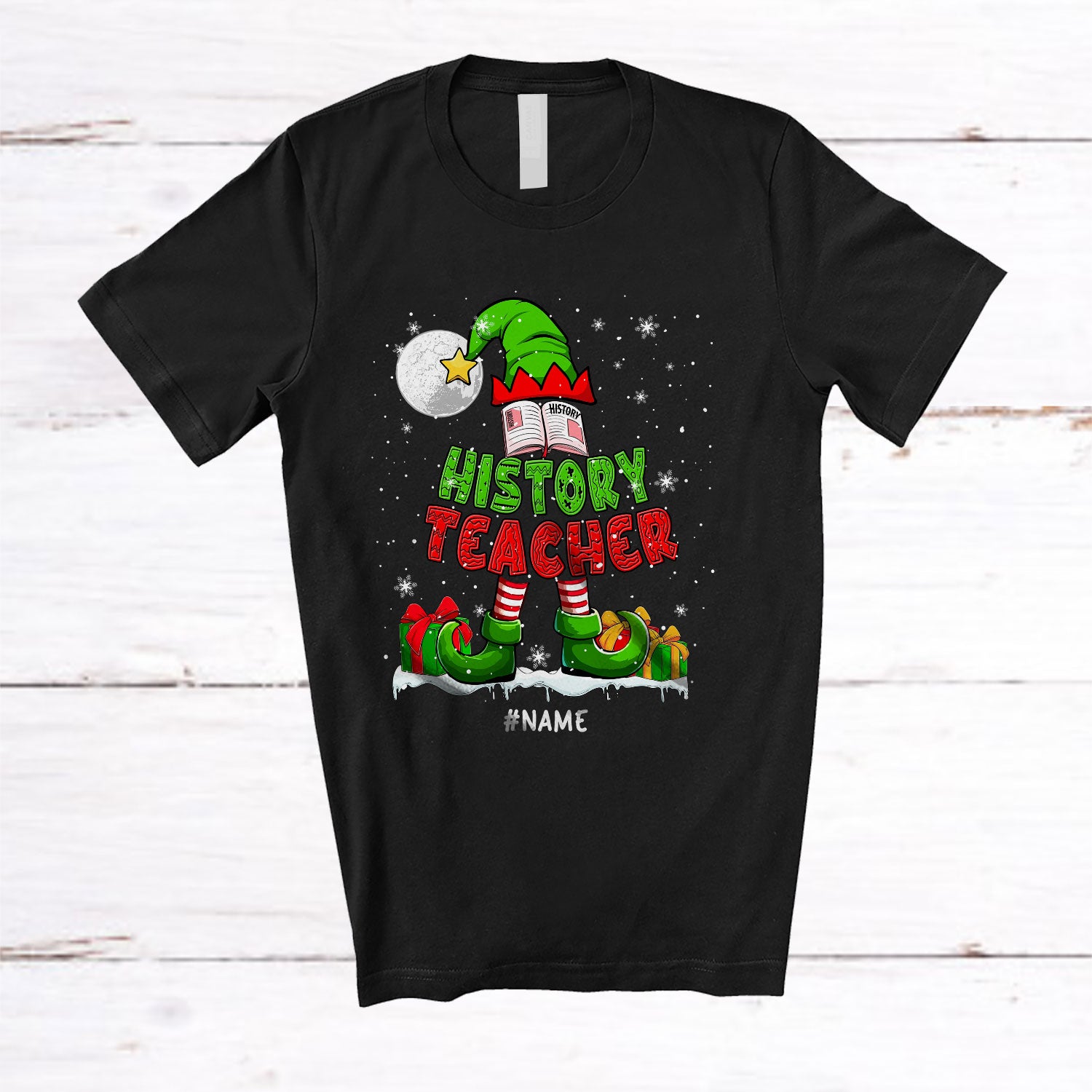 Personalized Custom Name History Teacher; Lovely Christmas Elf Snowing Book Education Jobs T-Shirt