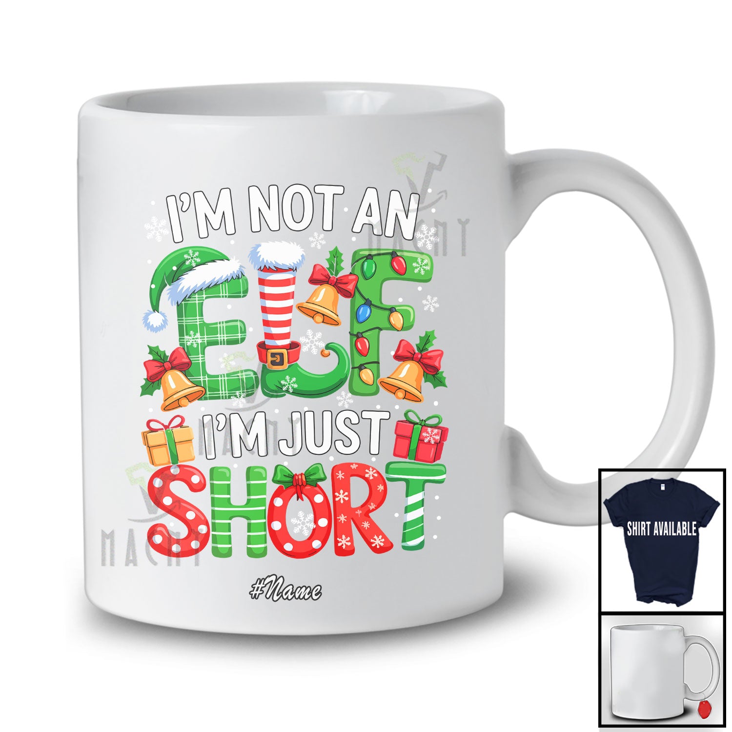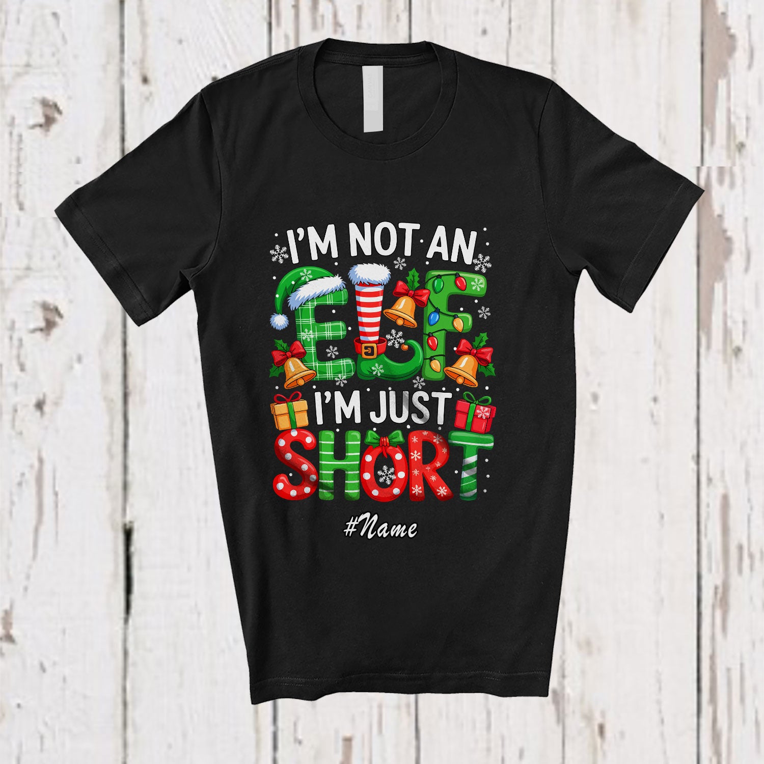 • Personalized Custom Name I'm Not An Elf I'm Just Short; Awesome Christmas Lights Family Group T-Shirt. This cotton t-shirt is a durable staple product with a classic fit. One of the most popular items, it has a relaxed style made for everyday and casual wear.
