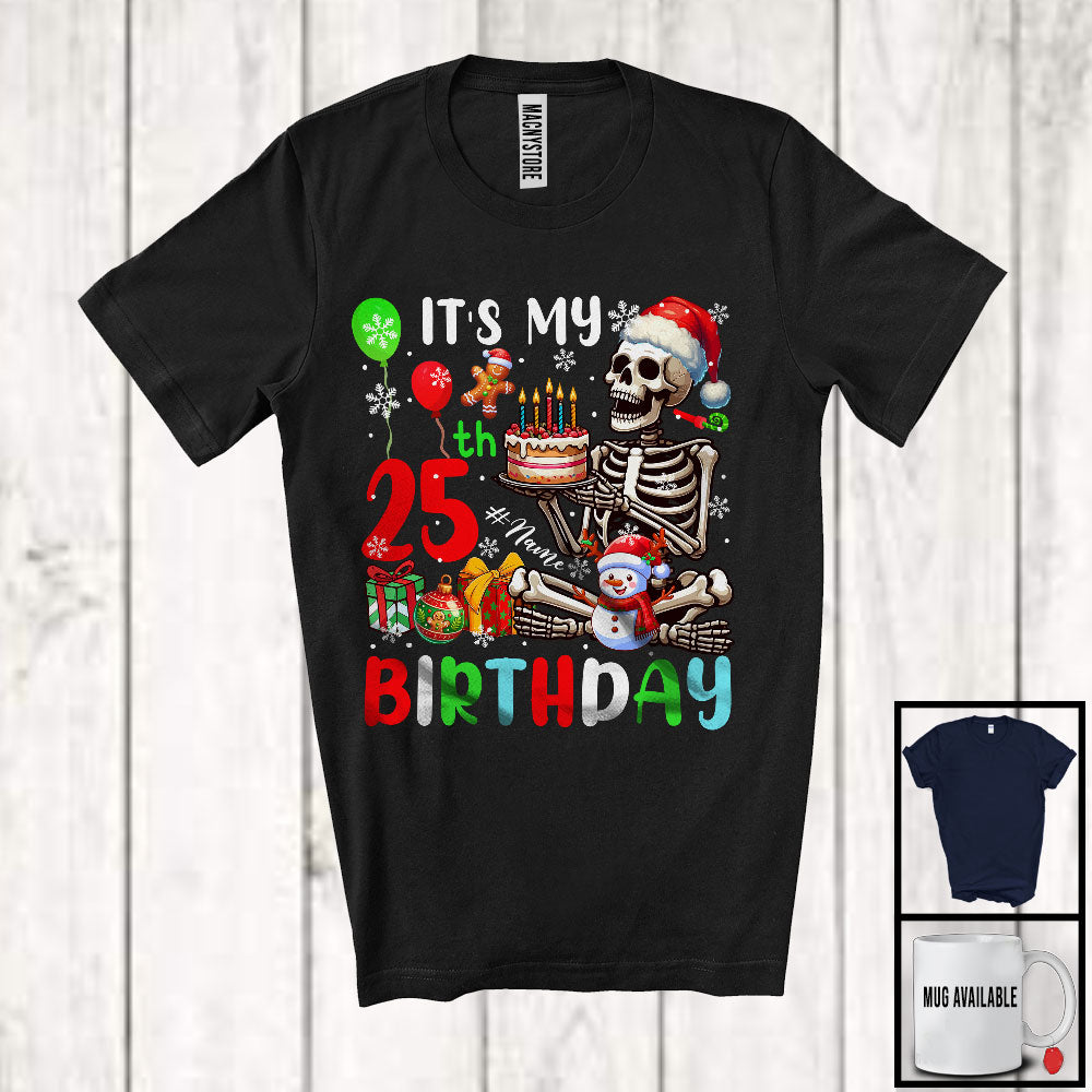 Personalized Custom Name It's My 25th Birthday; Cheerful Christmas Skeleton Santa; Family T-Shirt
