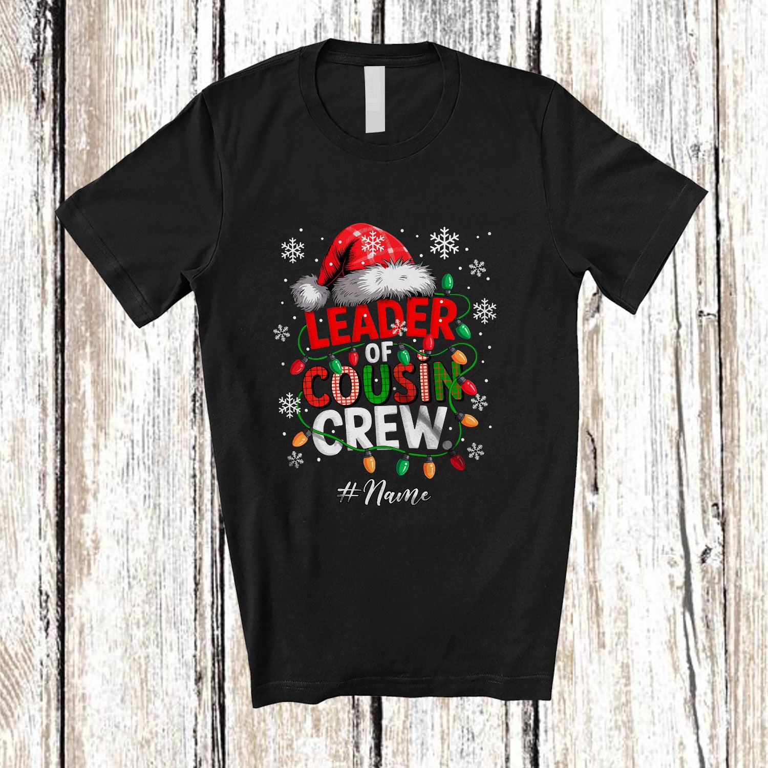 Personalized Custom Name Leader Of Cousin Crew; Merry Christmas Lights Plaid Santa; Family T-Shirt. This cotton t-shirt is a durable staple product with a classic fit. One of the most popular items, it has a relaxed style made for everyday and casual wear.