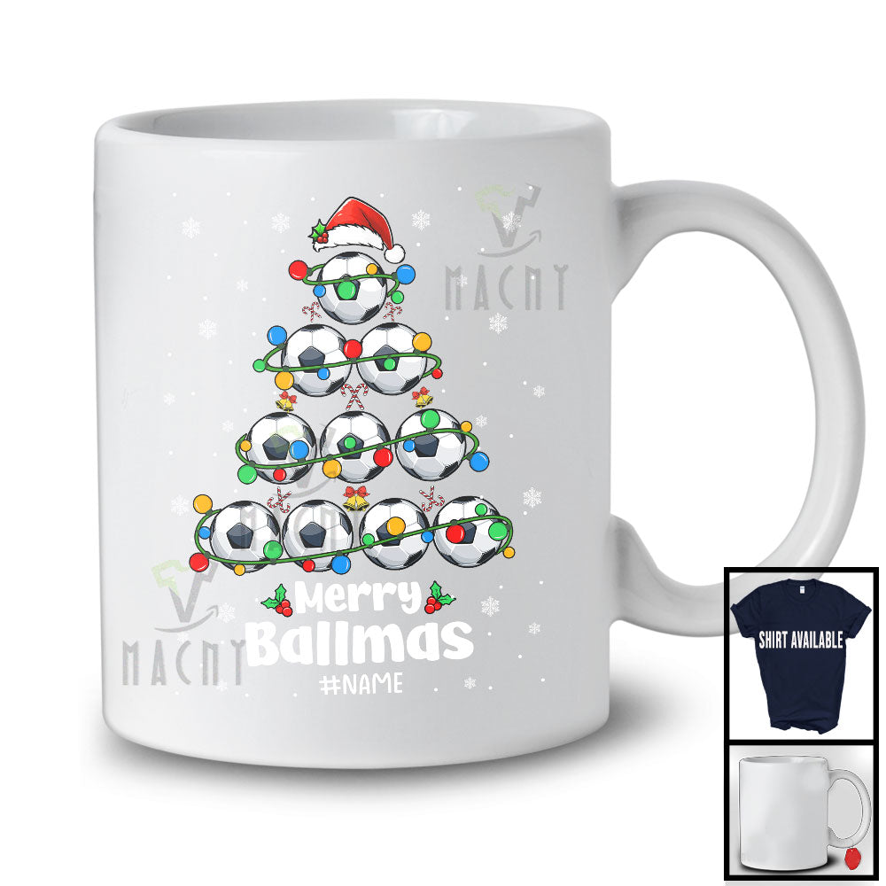 The Personalized Custom Name Merry Ballmas; Joyful Santa Soccer Christmas Tree; Sport Player Team T-Shirt destined to impress, and priced at only $12.95, for a limited time.