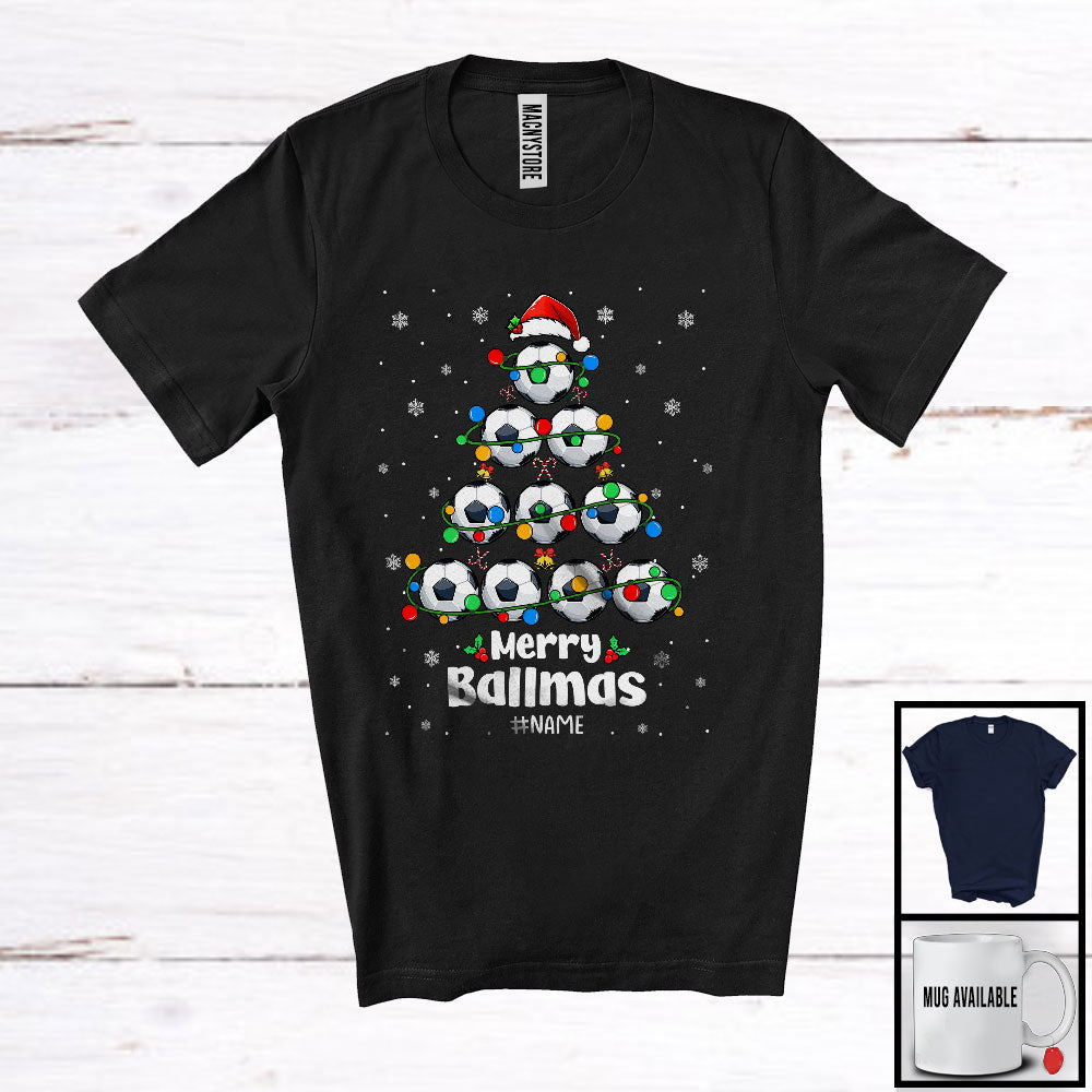 Personalized Custom Name Merry Ballmas; Joyful Santa Soccer Christmas Tree; Sport Player Team T-Shirt. This cotton t-shirt is a durable staple product with a classic fit. One of the most popular items, it has a relaxed style made for everyday and casual wear.