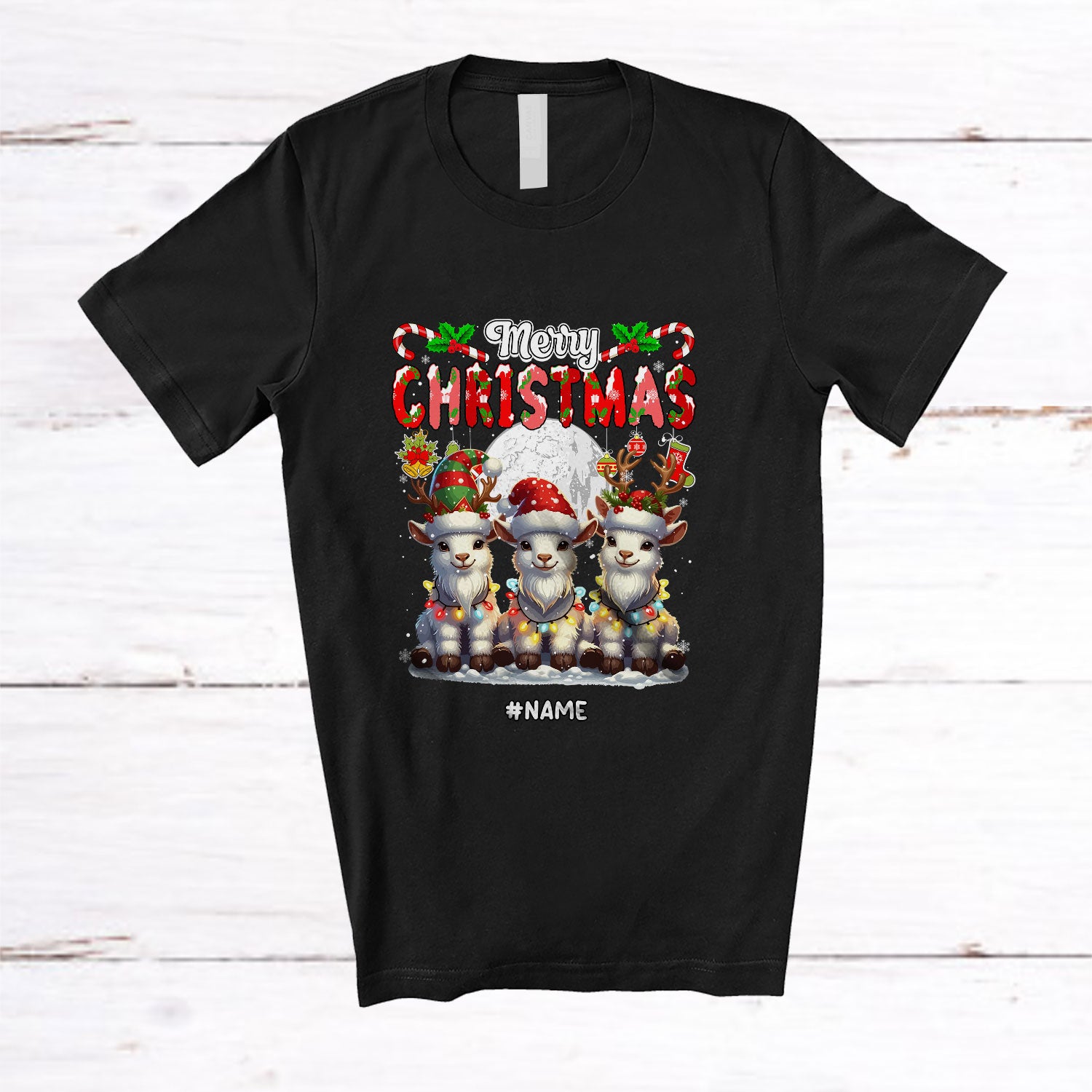 Personalized Custom Name Merry Christmas; Lovely X-mas Lights Three Goat Farmer Farming T-Shirt