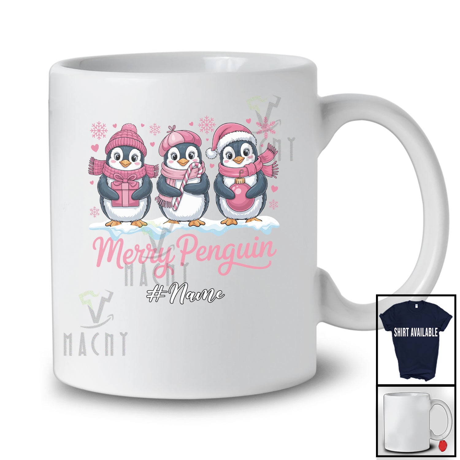 Personalized Custom Name Merry Penguin; Adorable Christmas Three Pink Santa Penguin; Family T-Shirt