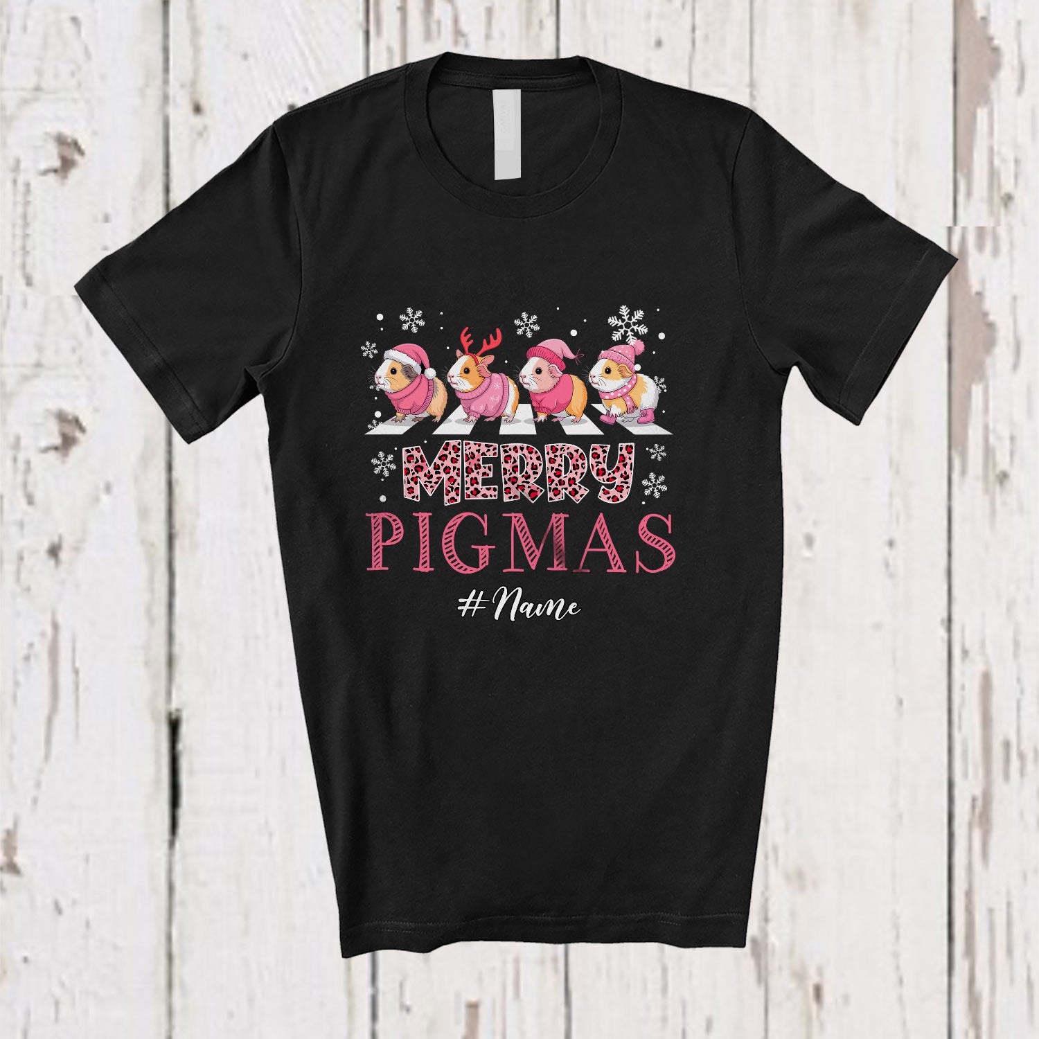 • Personalized Custom Name Merry Pigmas; Lovely Christmas Pink Leopard Four Santa Guinea Pig T-Shirt. This cotton t-shirt is a durable staple product with a classic fit. One of the most popular items, it has a relaxed style made for everyday and casual wear.