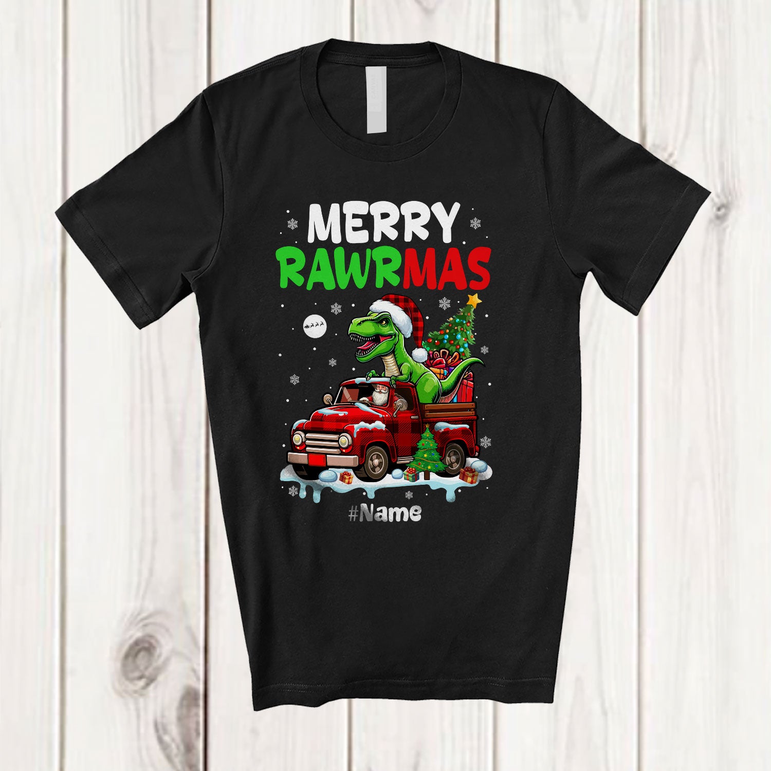 Personalized Custom Name Merry Rawrmas; Amusing Christmas T-Rex Dinosaur Riding Pickup Truck T-Shirt