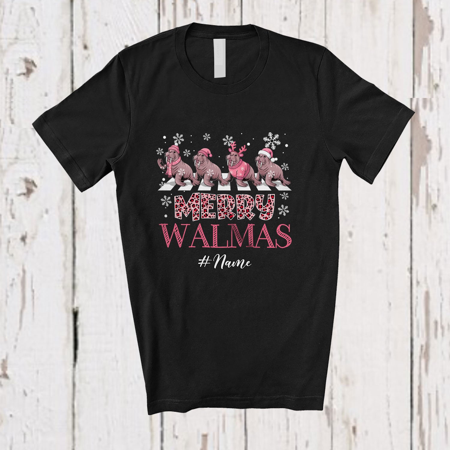 Personalized Custom Name Merry Walmas; Lovely Christmas Pink Leopard Four Santa Walrus T-Shirt. This cotton t-shirt is a durable staple product with a classic fit. One of the most popular items, it has a relaxed style made for everyday and casual wear.