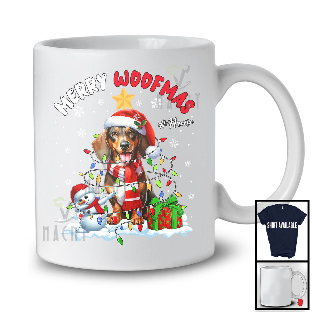 • Personalized Custom Name Merry Woofmas; Lovely Christmas Lights Santa Dachshund; Snowman T-Shirt. This cotton t-shirt is a durable staple product with a classic fit. One of the most popular items, it has a relaxed style made for everyday and casual wear.