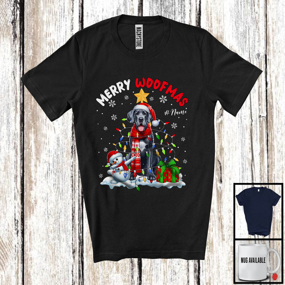 Personalized Custom Name Merry Woofmas; Lovely Christmas Lights Santa Great Dane; Snowman T-Shirt